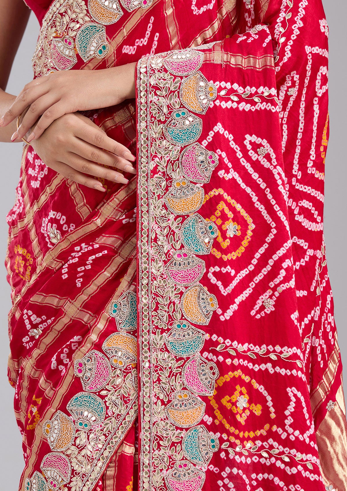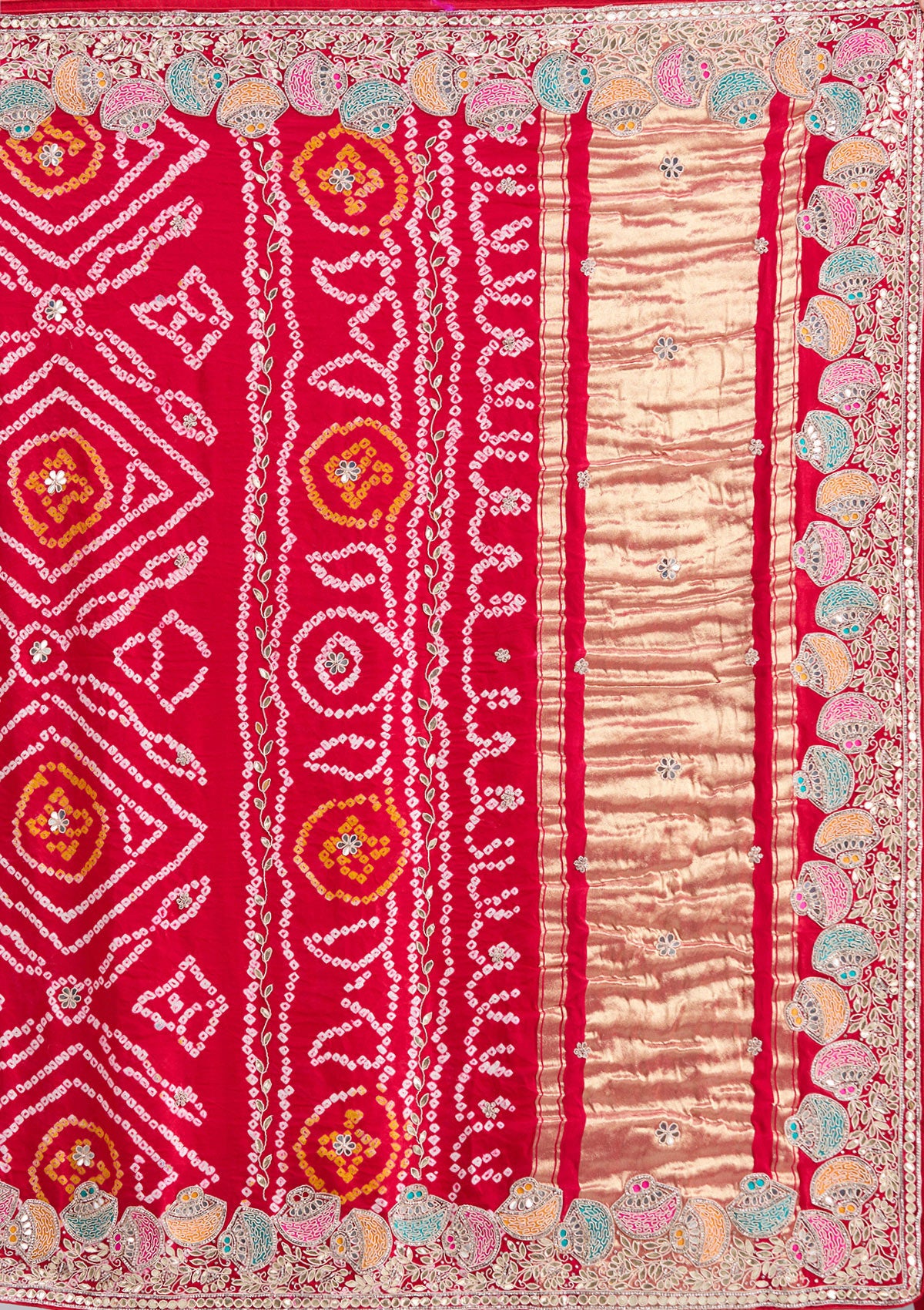 Red Saree in Silk fabric. The Saree is elevated with Gotapatti embroidery. It comes with an Unstitched blouse. Comes with the Koskii promise of premium quality.