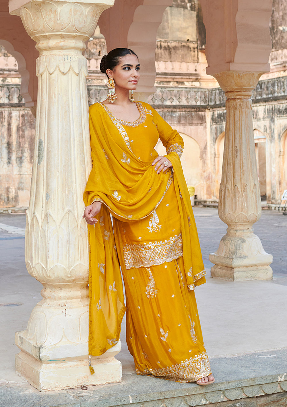 | Mustard Yellow Zariwork (Gold) Chinon Readymade Salwar Suit | ₹ 10,990 | |