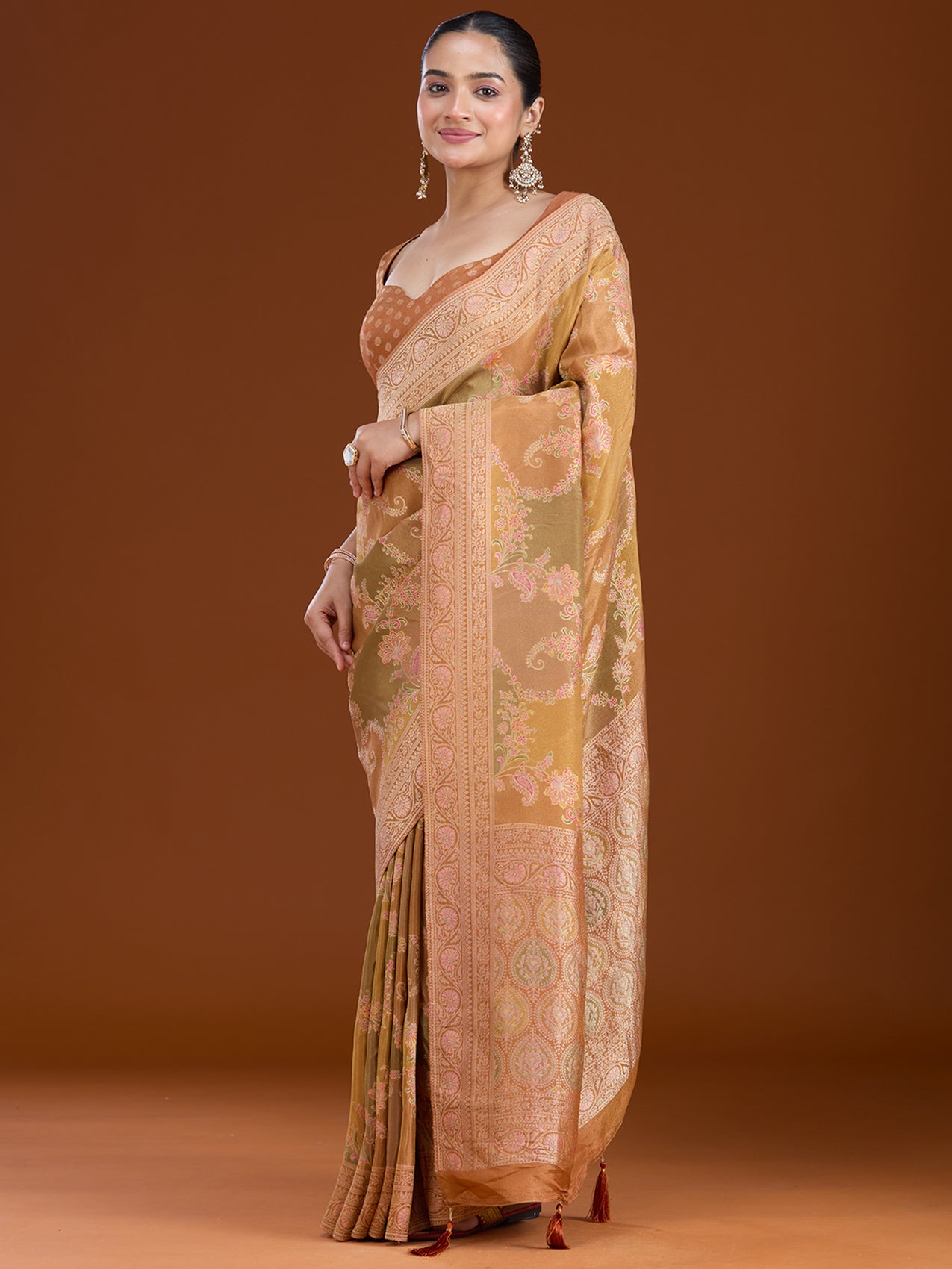 Mustard Silk_Saree in Chiffon fabric. The Silk_Saree is elevated with Cutdana embroidery. It comes with an Unstitched blouse. Comes with the Koskii promise of premium quality.