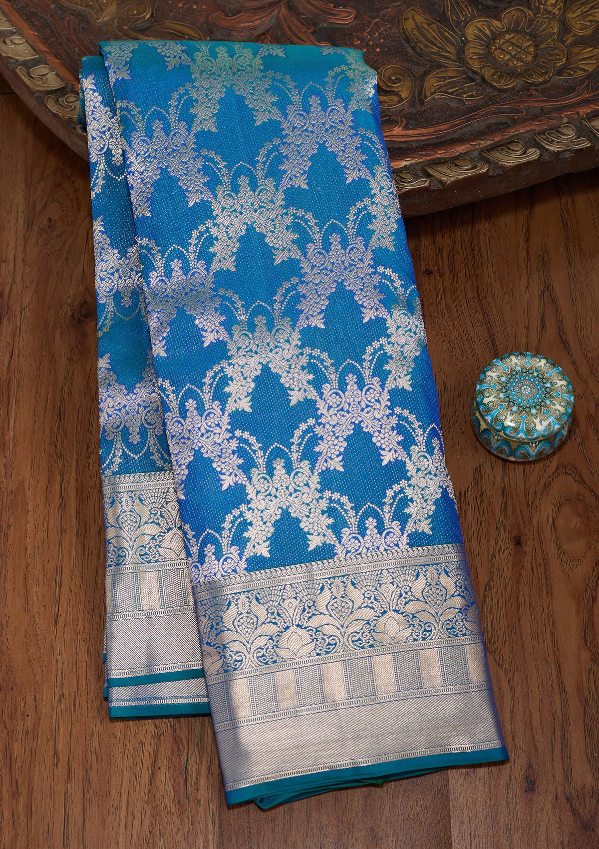 Peacock Blue Silk_Saree in Pure Silk fabric. The Silk_Saree is elevated with Zariwork (Gold) embroidery. It comes with an Unstitched blouse. Comes with the Koskii promise of premium quality.