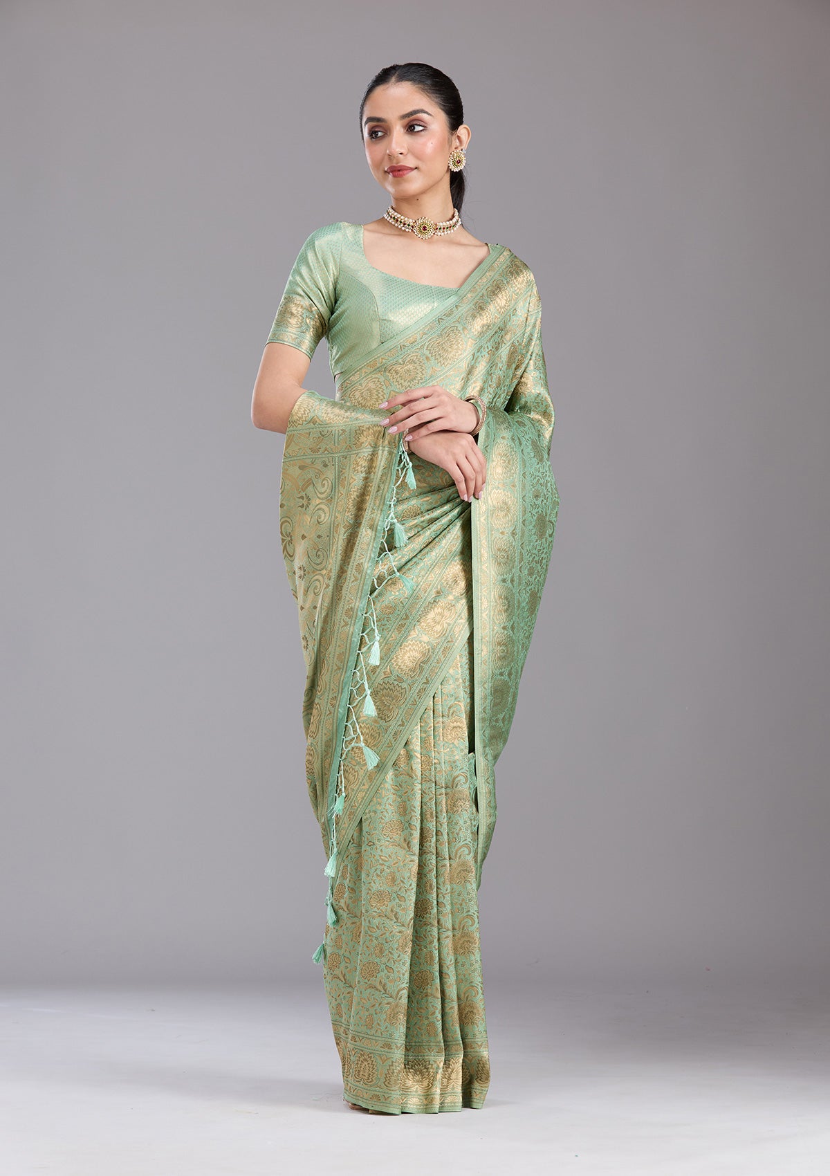 Pista Green Silk_Saree in Art Silk fabric. The Silk_Saree is elevated with Zariwork embroidery. It comes with an Unstitched blouse. Comes with the Koskii promise of premium quality.