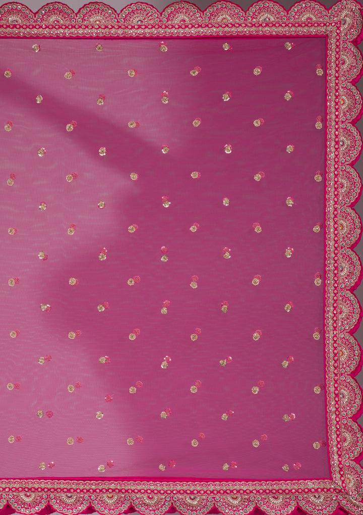 Unleash your inner diva with Koskii's spectacular fuchsia lehenga, a masterpiece crafted from luxurious raw silk. This stunning ensemble is meticulously adorned with intricate Zardosi embroidery, featuring floral motifs that cascade over the swirls of the full, richly hued skirt. Whether you're twirling on the dance floor at a wedding or celebrating traditions in style, this lehenga embodies the perfect blend of old-world charm and contemporary flair.