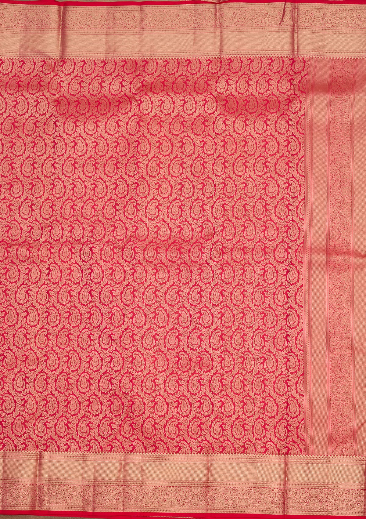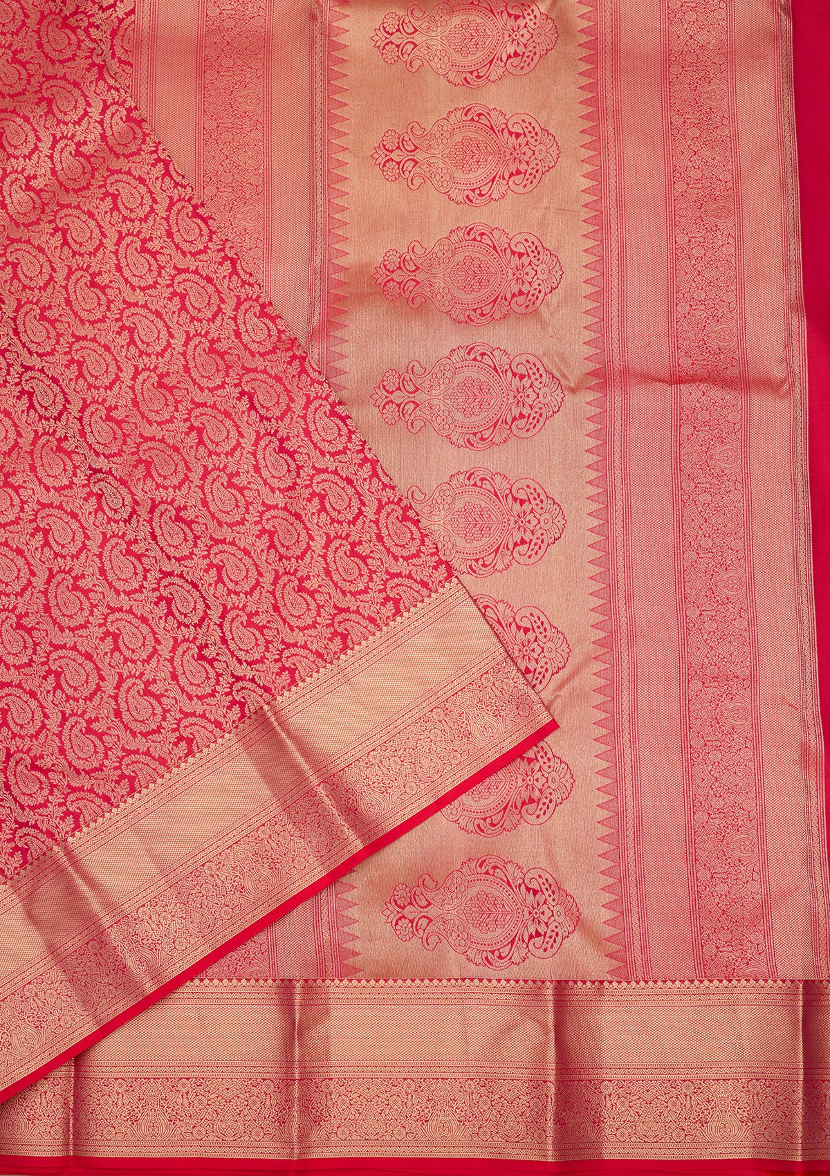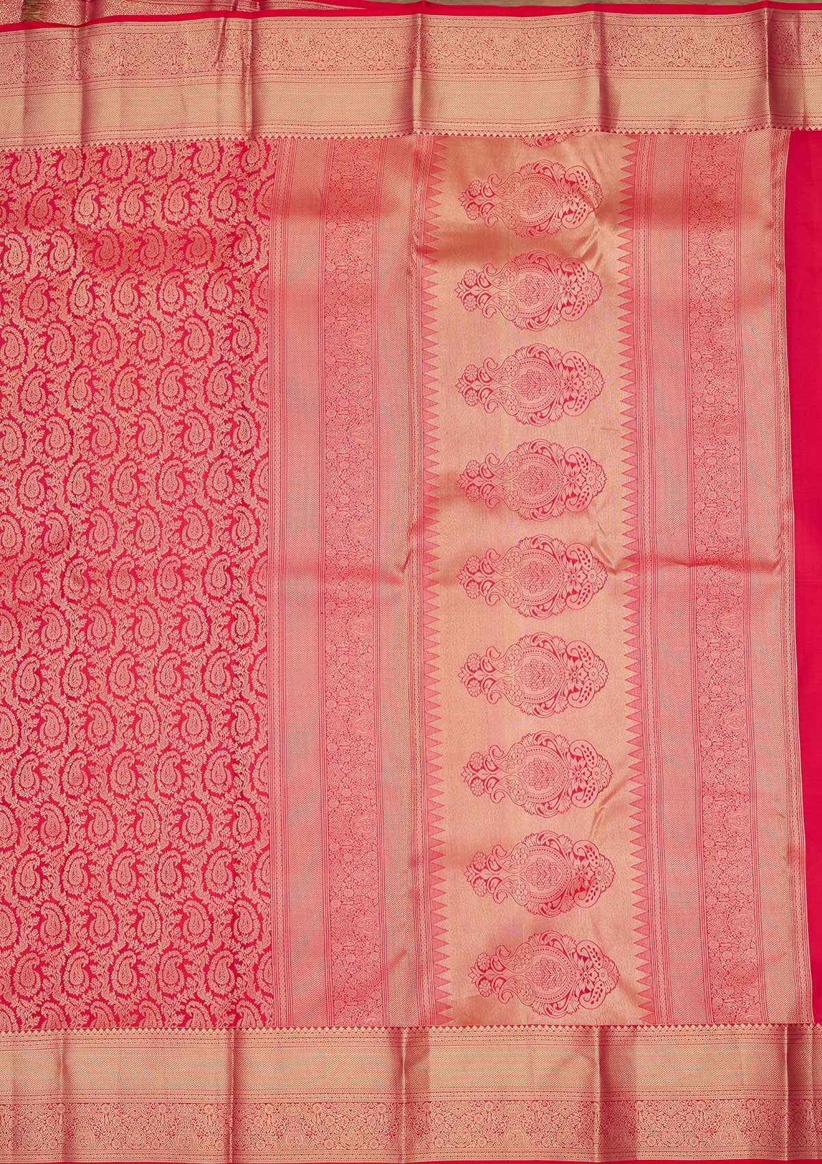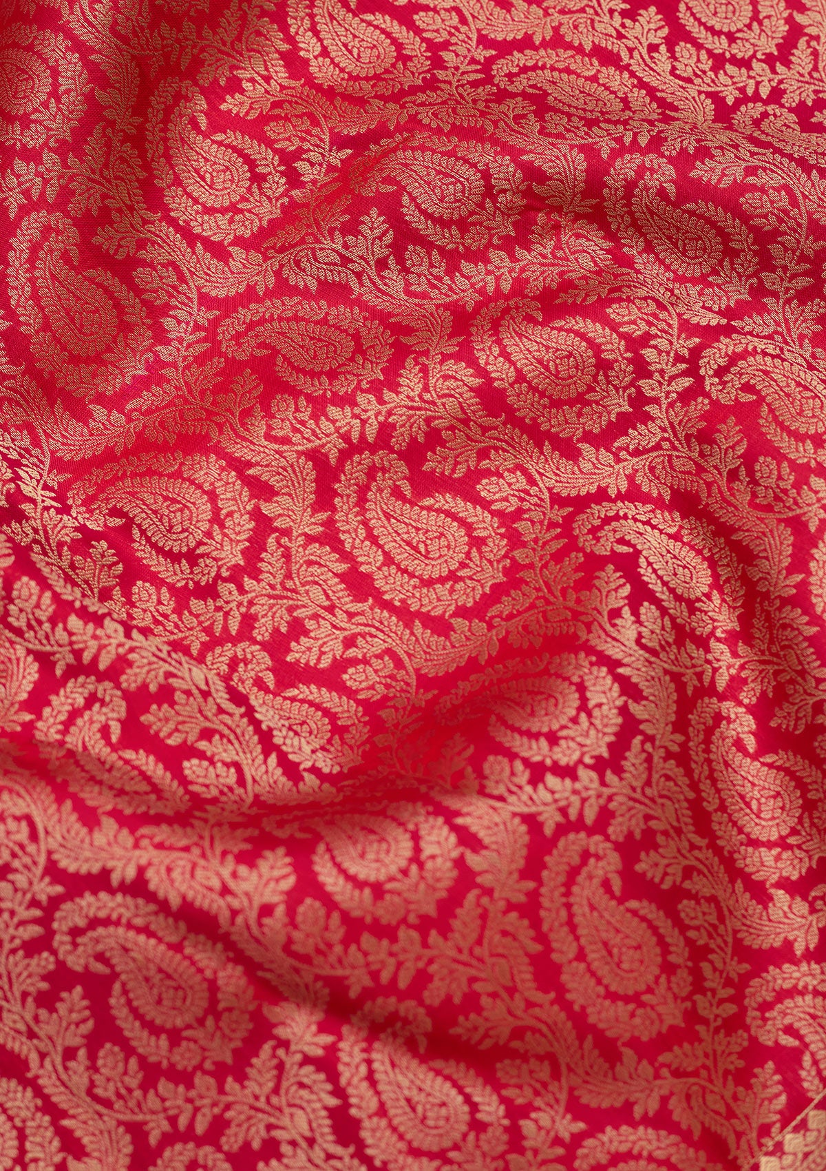 Rani Pink Silk_Saree in Silk fabric. The Silk_Saree is elevated with Zariwork (Gold) embroidery. It comes with an Unstitched blouse. Comes with the Koskii promise of premium quality.