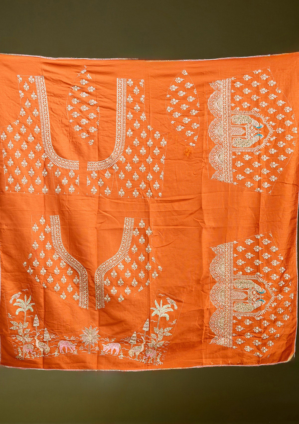 Rust Readymade Lehenga in Raw Silk fabric. The Lehenga is embellished with Zardozi (Gold) embroidery. Accompanied with an Readymade blouse and dupatta. Comes with the Koskii promise of premium quality.
