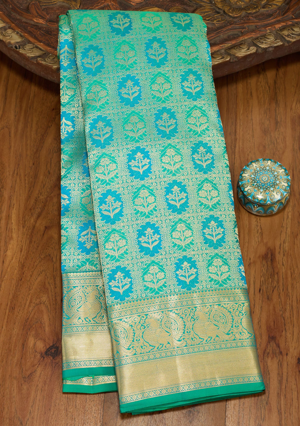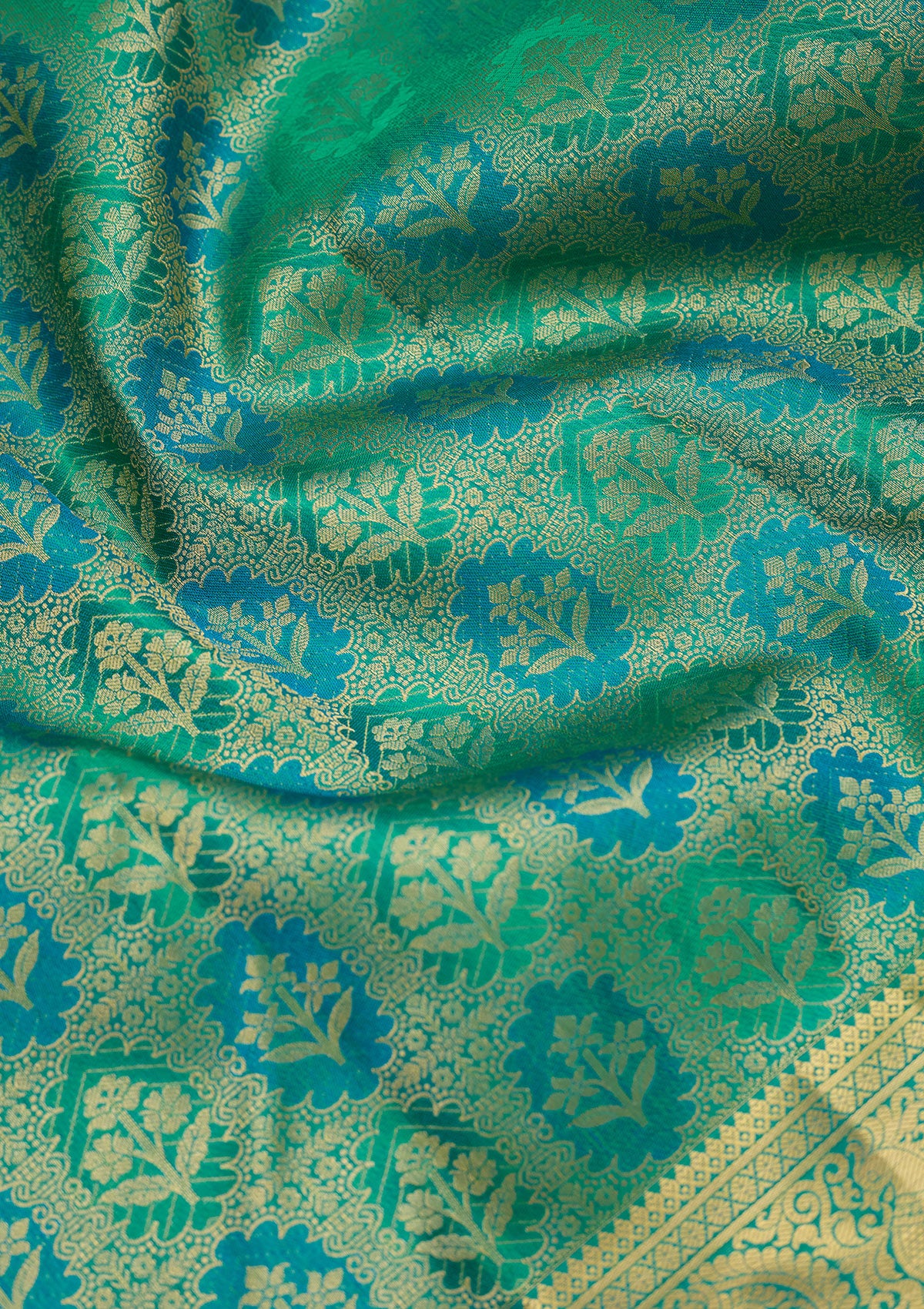 Sea Green Silk_Saree in Silk fabric. The Silk_Saree is elevated with Zariwork (Gold) embroidery. It comes with an Unstitched blouse. Comes with the Koskii promise of premium quality.