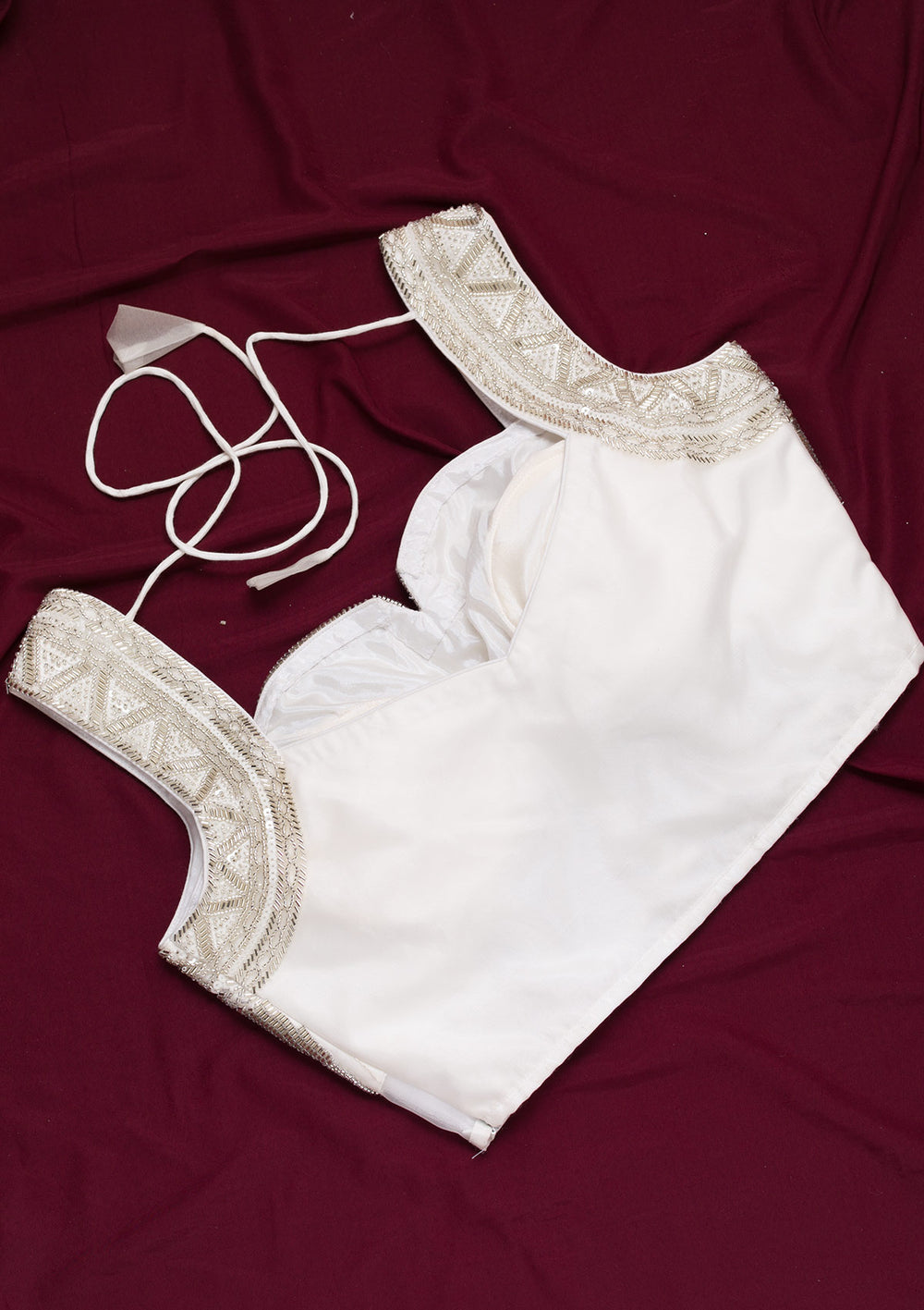 White Ready to Wear Padded Blouse in Net fabric. The CUTDANA SLEEVELESS Blouse has a Deep V Neckline. Comes with the Koskii promise of premium quality.