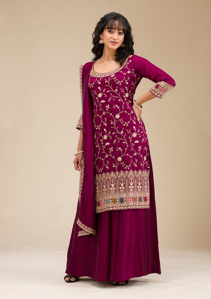 Wine Zariwork (Gold) Soft Raw Silk Readymade Salwar Suit