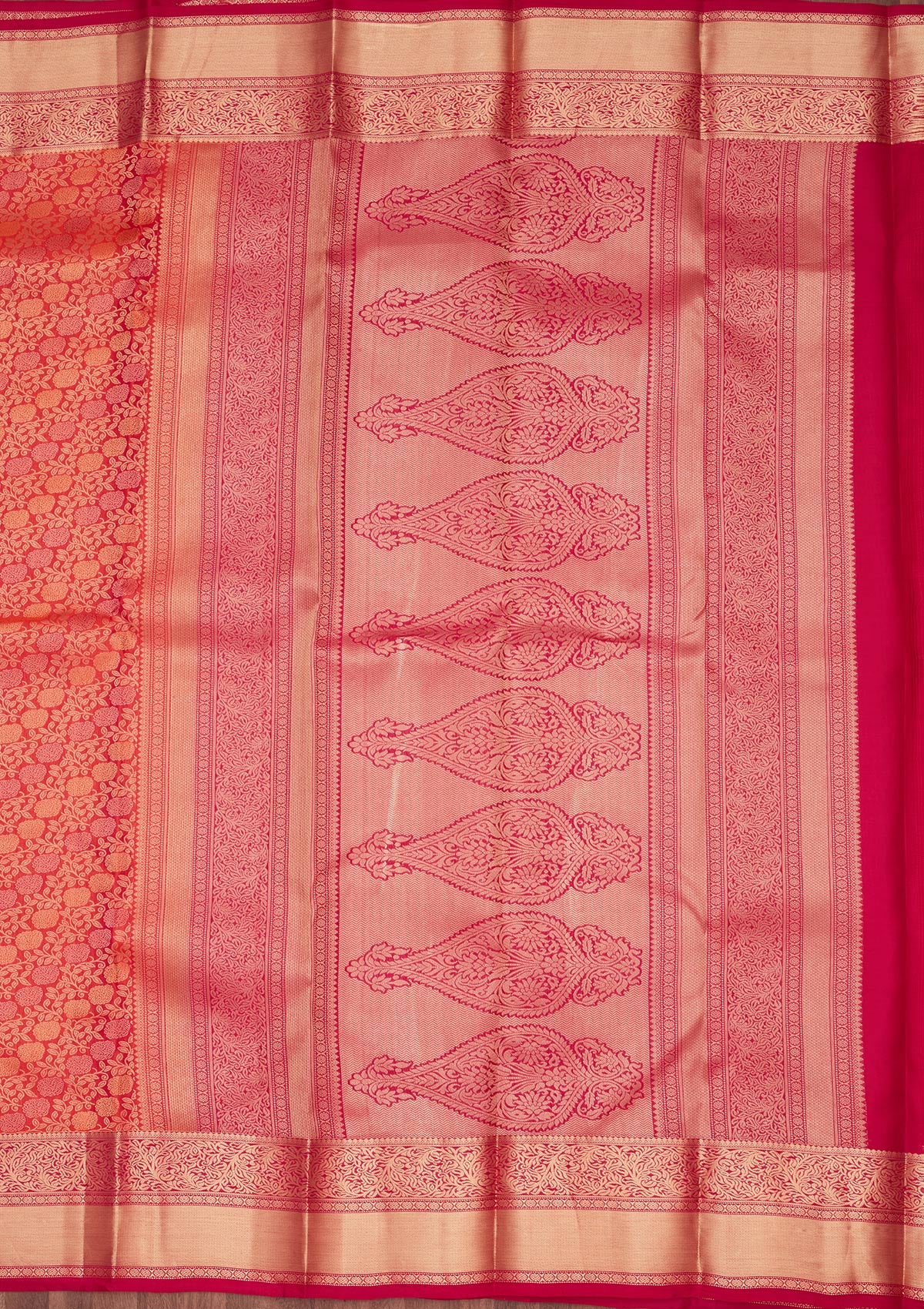 Orange Silk Saree in Pure Silk fabric. The Silk Saree is elevated with Zariwork embroidery. It comes with an Unstitched blouse. Comes with the Koskii promise of premium quality.