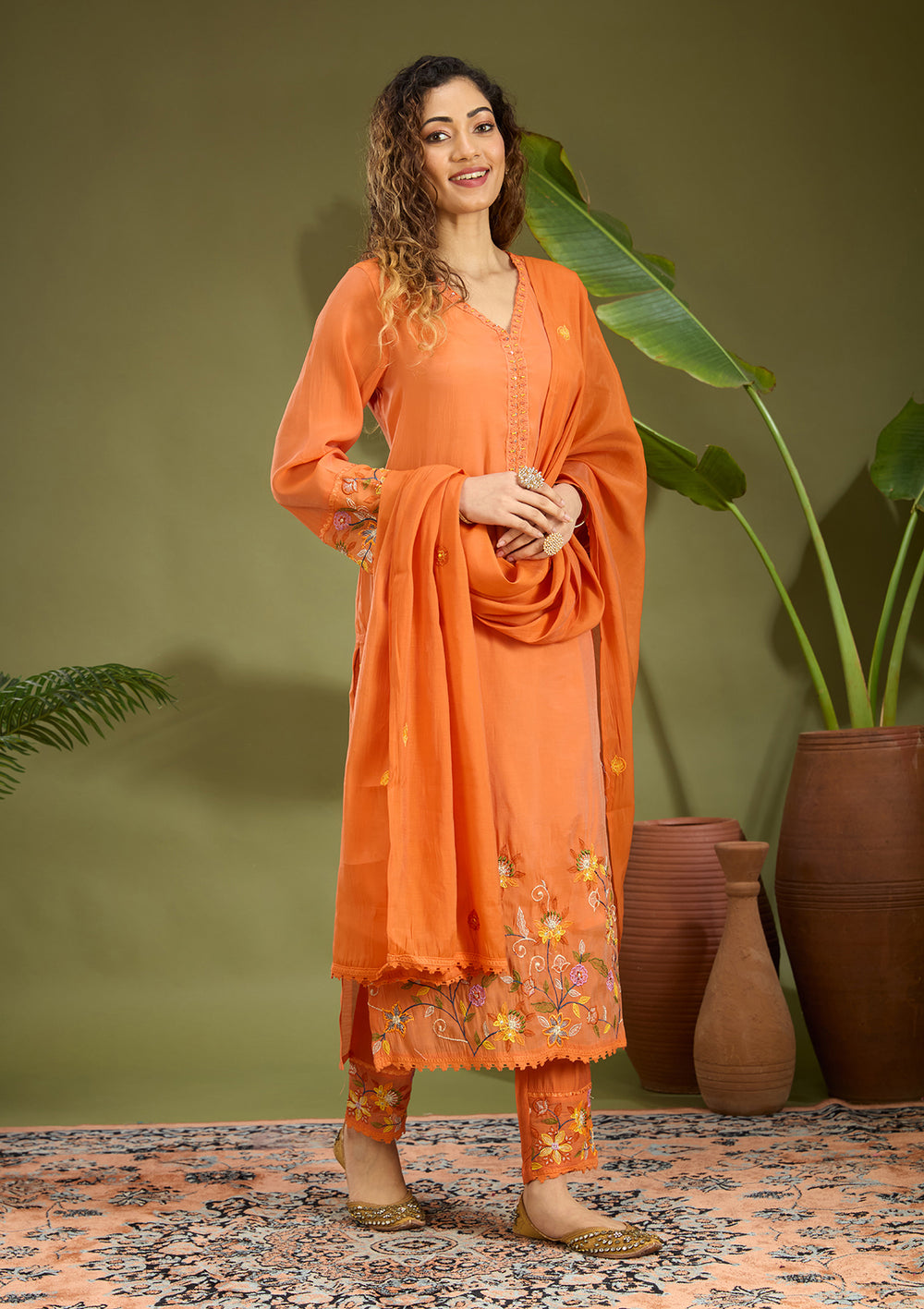 - Our orange salwar suits are crafted with skin-friendly fabrics to offer you a comfortable feel for day-long events. From georgette to semi-crepe and art silk to chanderi, you can avail anything that soothes your skin.