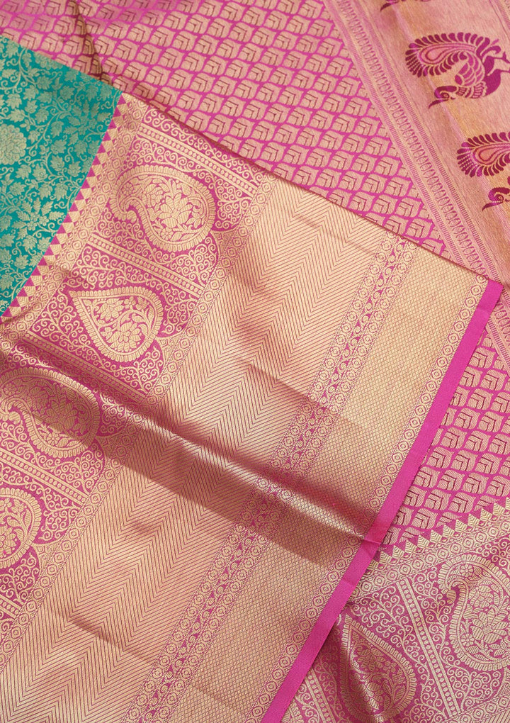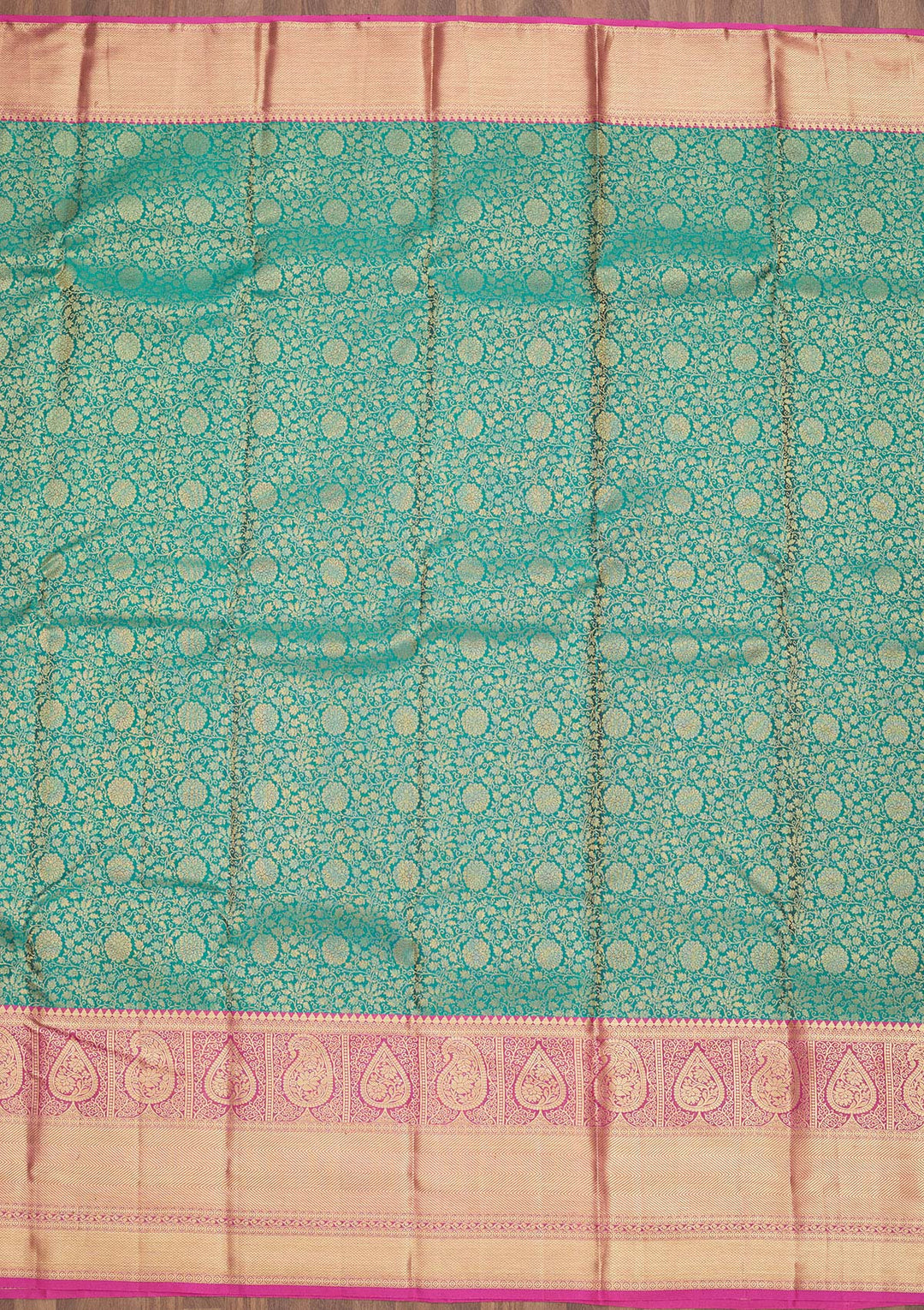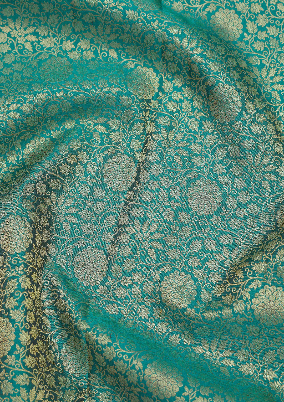 Rama Green Saree in Pure Silk fabric. The Saree is elevated with Zariwork embroidery. It comes with an Unstitched blouse. Comes with the Koskii promise of premium quality.