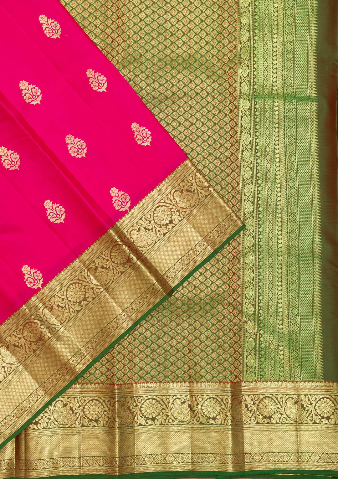 Rani Pink Saree in Pure Silk fabric. The Saree is elevated with Zariwork embroidery. It comes with an Unstitched blouse. Comes with the Indian Silk Mark certification.