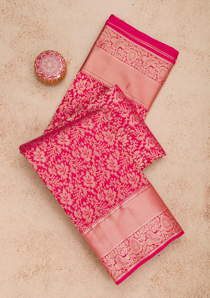 Rani Pink Saree in Pure Silk fabric The Saree is elevated with Zariwork embroidery It comes with an Unstitched blouse Comes with the Koskii promise of premium quality.