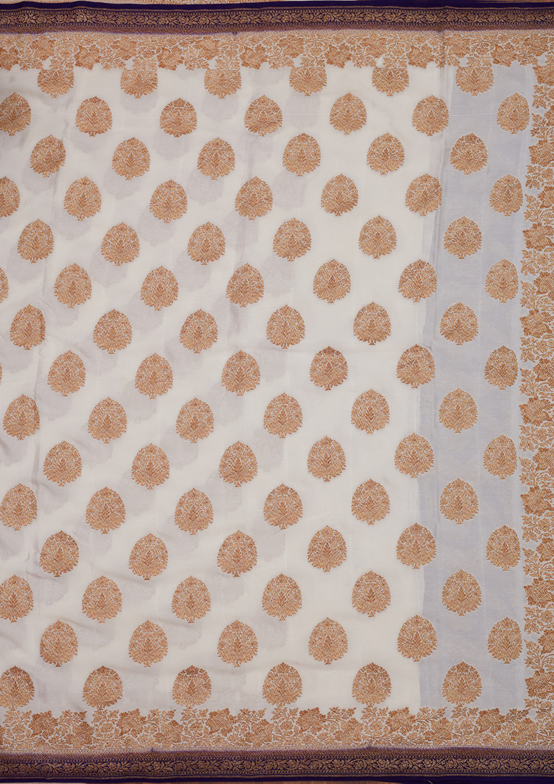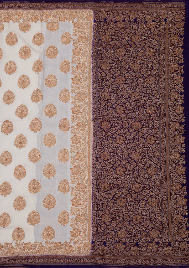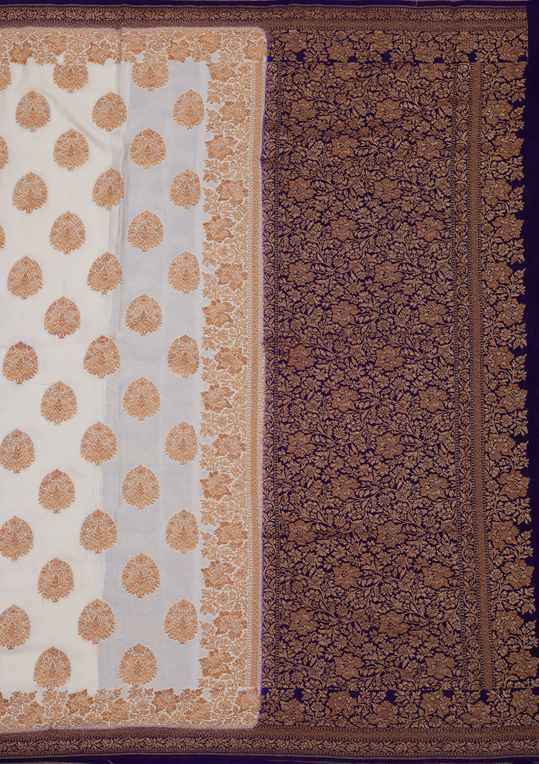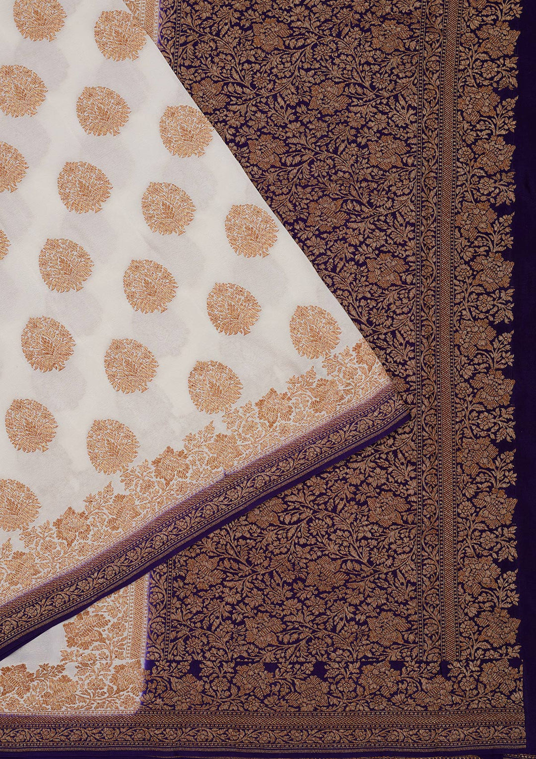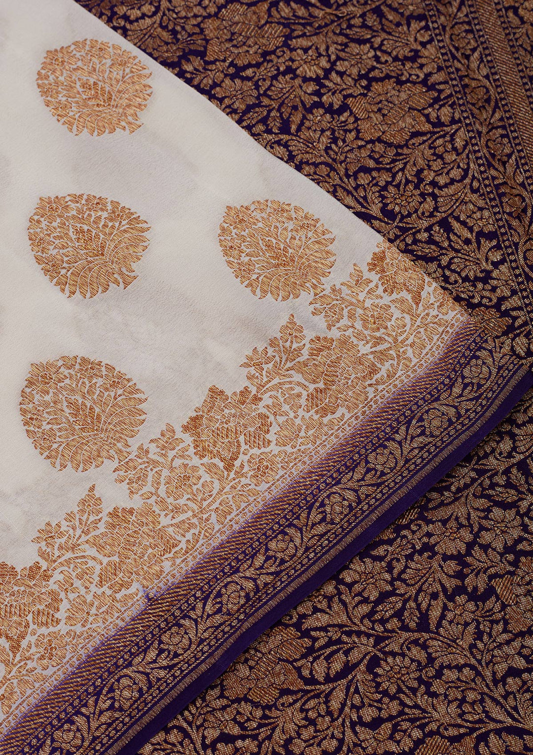 White Saree in Pure Silk fabric. The Saree is elevated with Zariwork embroidery. It comes with an Unstitched blouse. Comes with the Koskii promise of premium quality.