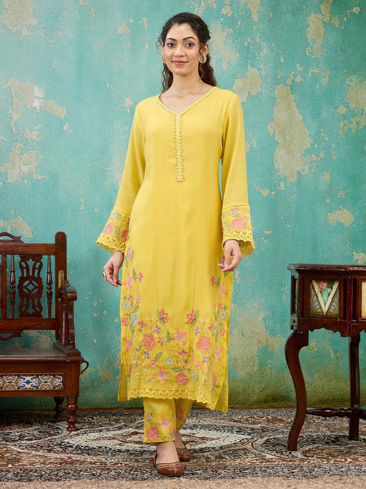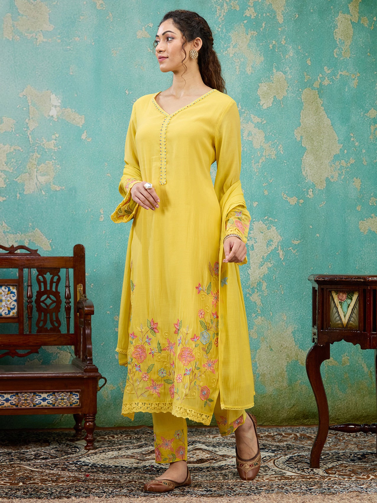 Yellow Salwar Suit in Chanderi fabric. The Salwar Suit is embellished with Threadwork embroidery. Accompanied with a bottom and dupatta. Comes with the Koskii promise of premium quality.