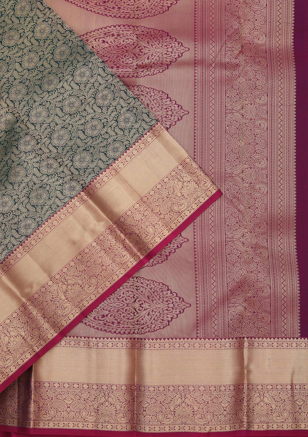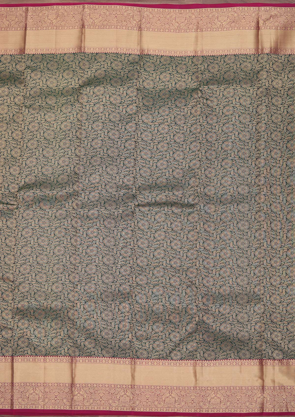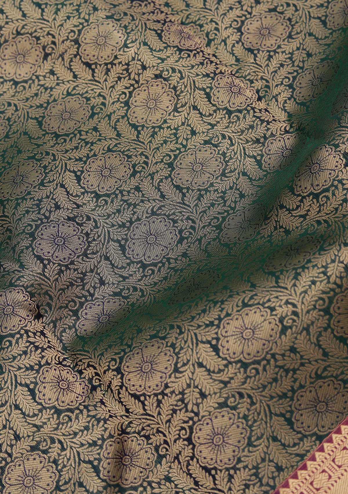 Bottle Green Silk Saree in Pure Silk fabric. The Silk Saree is elevated with Zariwork embroidery. It comes with an Unstitched blouse. Comes with the Koskii promise of premium quality.