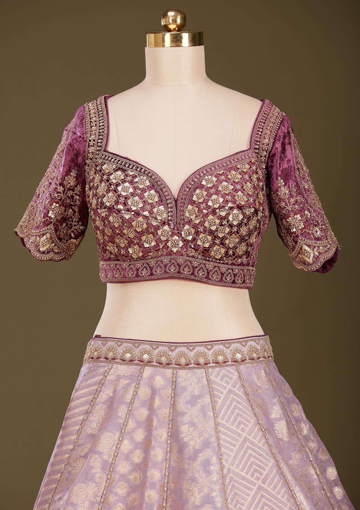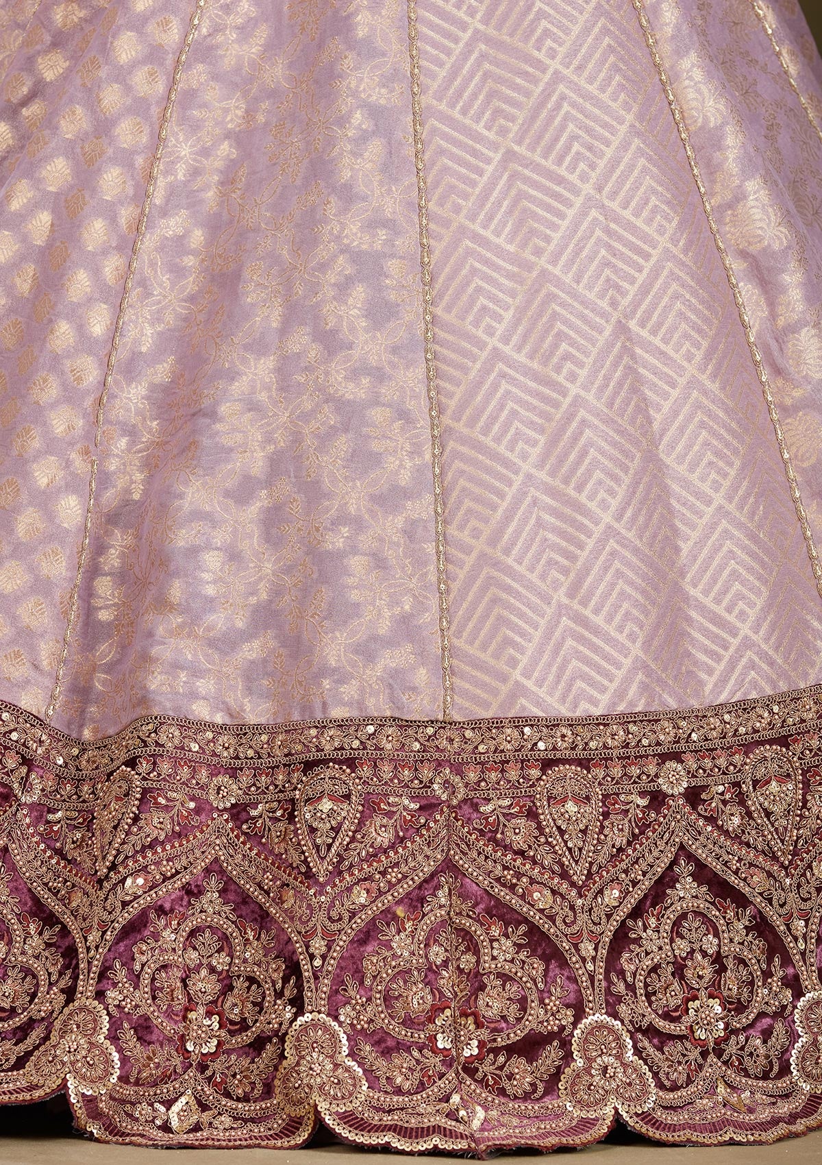Mauve Readymade Lehenga in Brocade fabric. The Lehenga is embellished with Cording embroidery. Accompanied with an Readymade blouse and dupatta. Comes with the Koskii promise of premium quality.