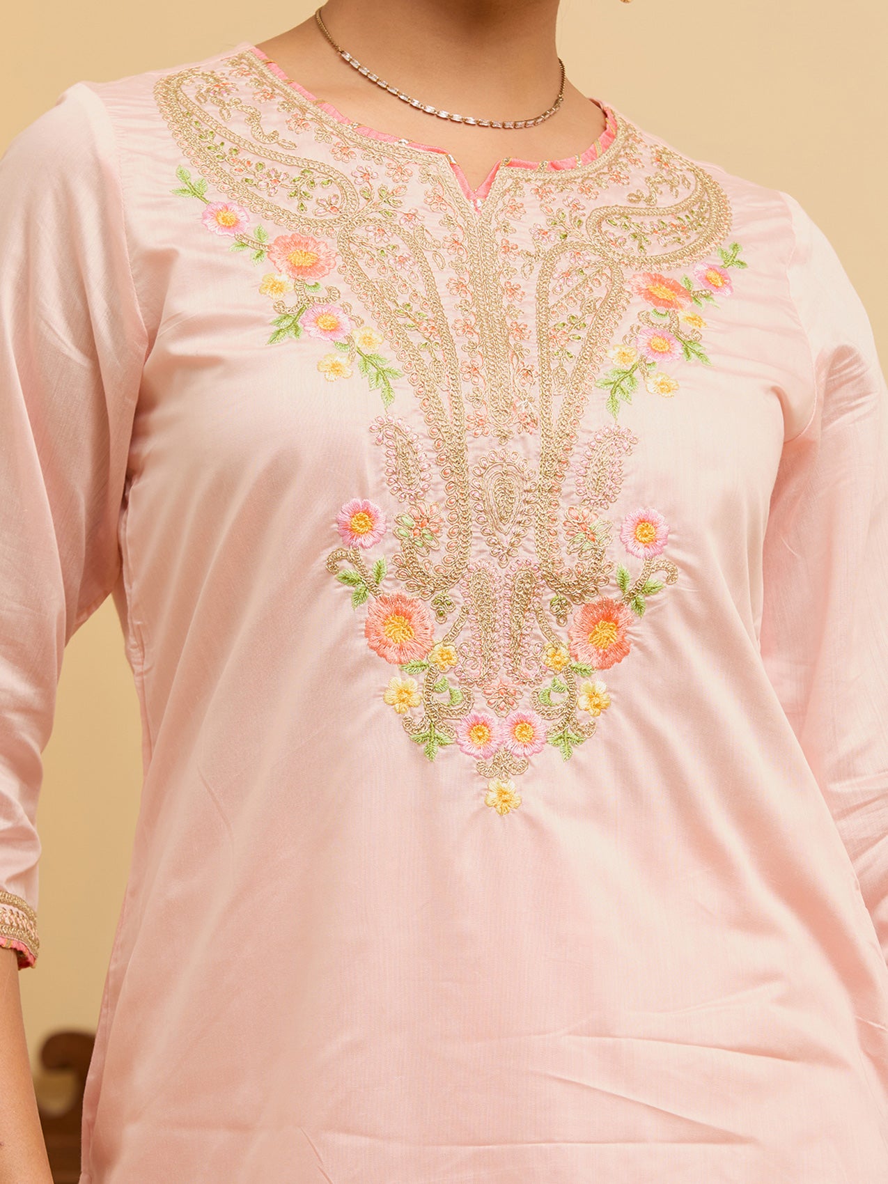 Peach Salwar Suit in Chanderi fabric. The Salwar Suit is embellished with Cording embroidery. Accompanied with a bottom and dupatta. Comes with the Koskii promise of premium quality.
