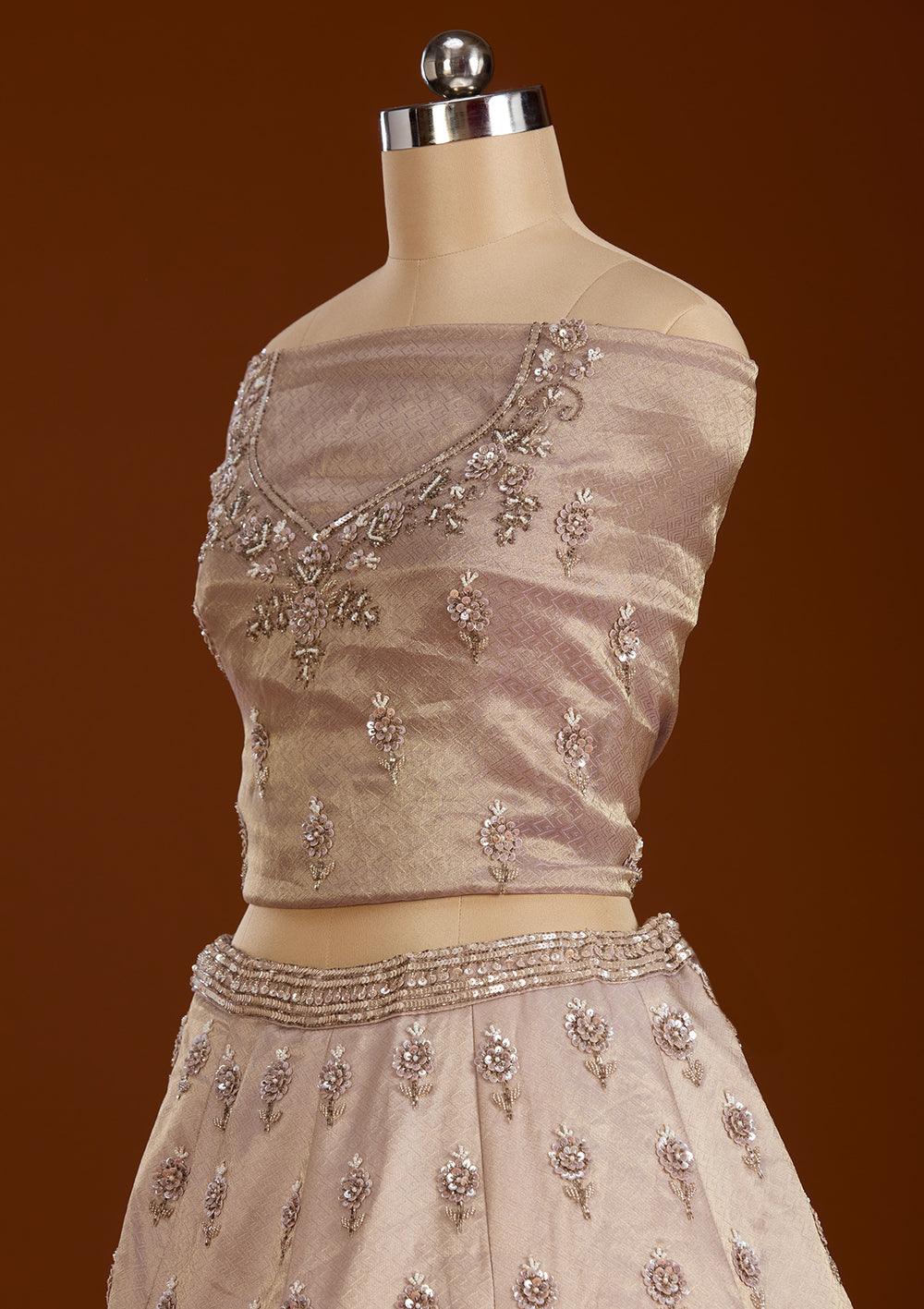 Ethnic apparel is known for its detailed embroidery on luxurious fabrics. At Koskii, you’ll find lehengas for reception parties adorned with zari and threadwork. Intricate floral and vine motifs in golden zari elevate your elegance. Try our onion pink lehenga with elaborate zari embroidery and exude everlasting charm.
