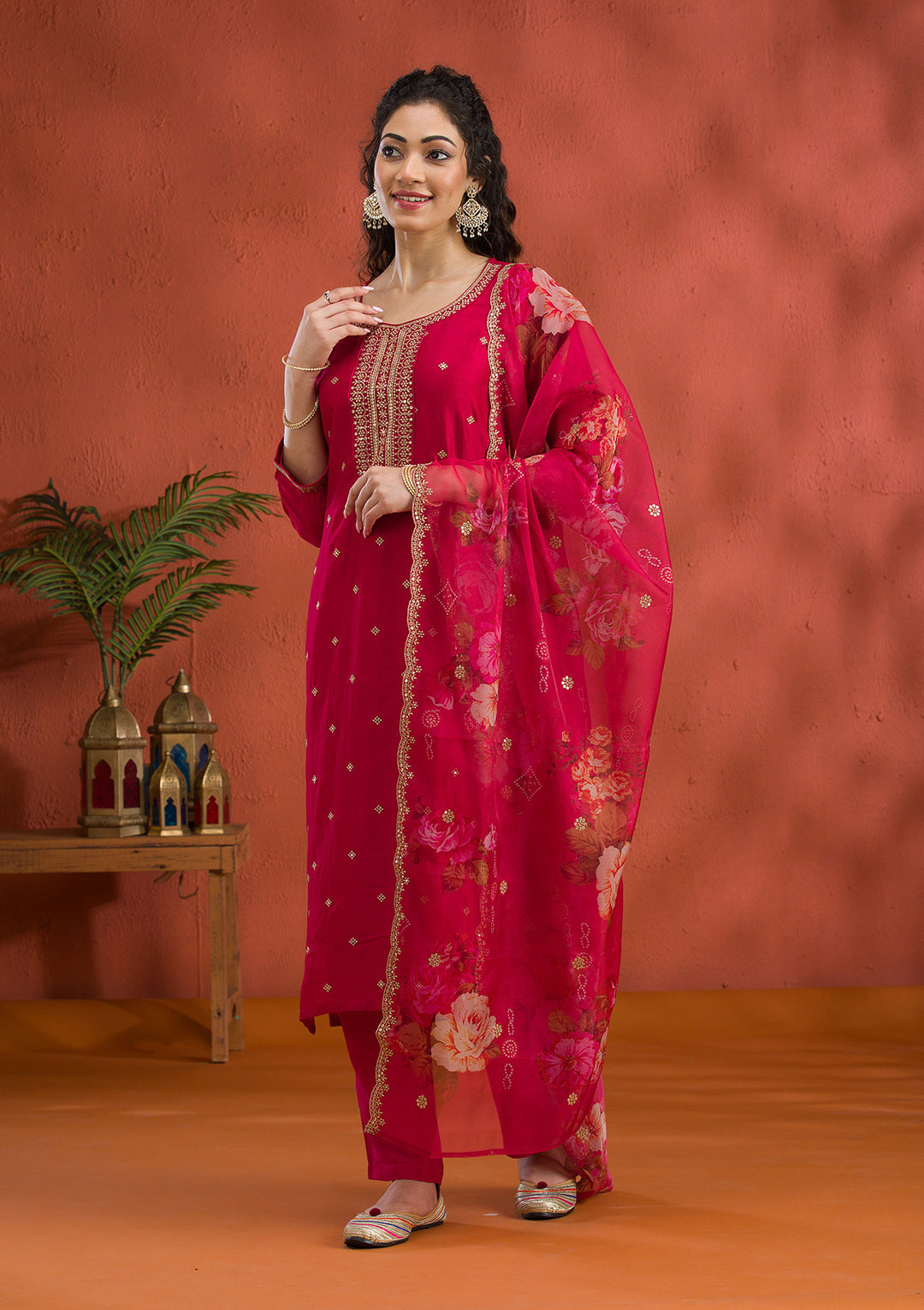 A red salwar suit blends tradition with modern comfort. Ideal for various events, the vibrant colour adds warmth and style to your ensemble.