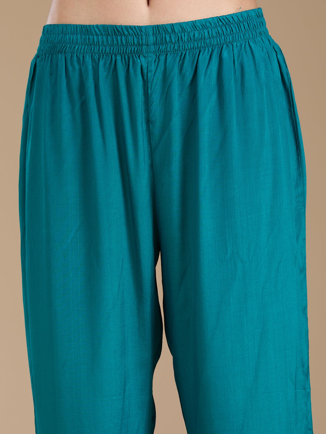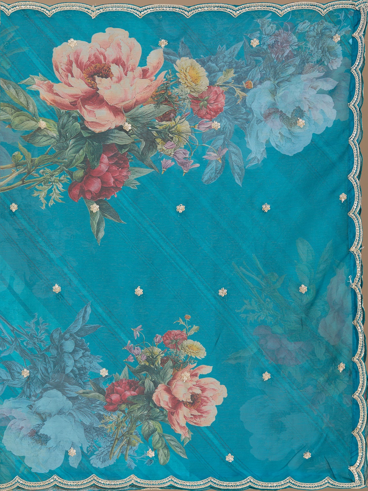 Turquoise Blue Salwar Suit in Soft Raw Silk fabric. The Salwar Suit is embellished with Zariwork embroidery. Accompanied with a bottom and dupatta. Comes with the Koskii promise of premium quality.