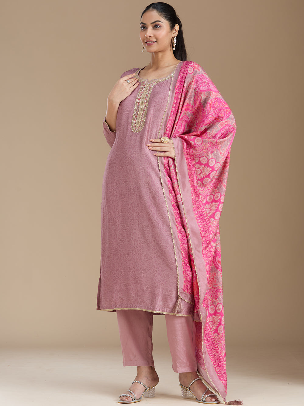 | Pink Threadwork Chanderi Readymade Salwar Suit | ₹ 2,454 | |