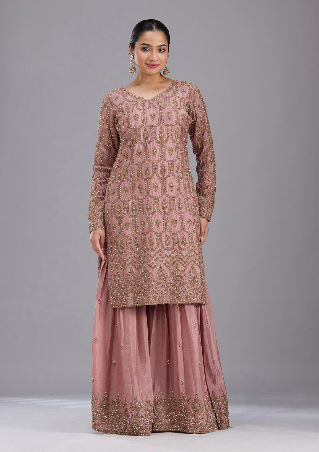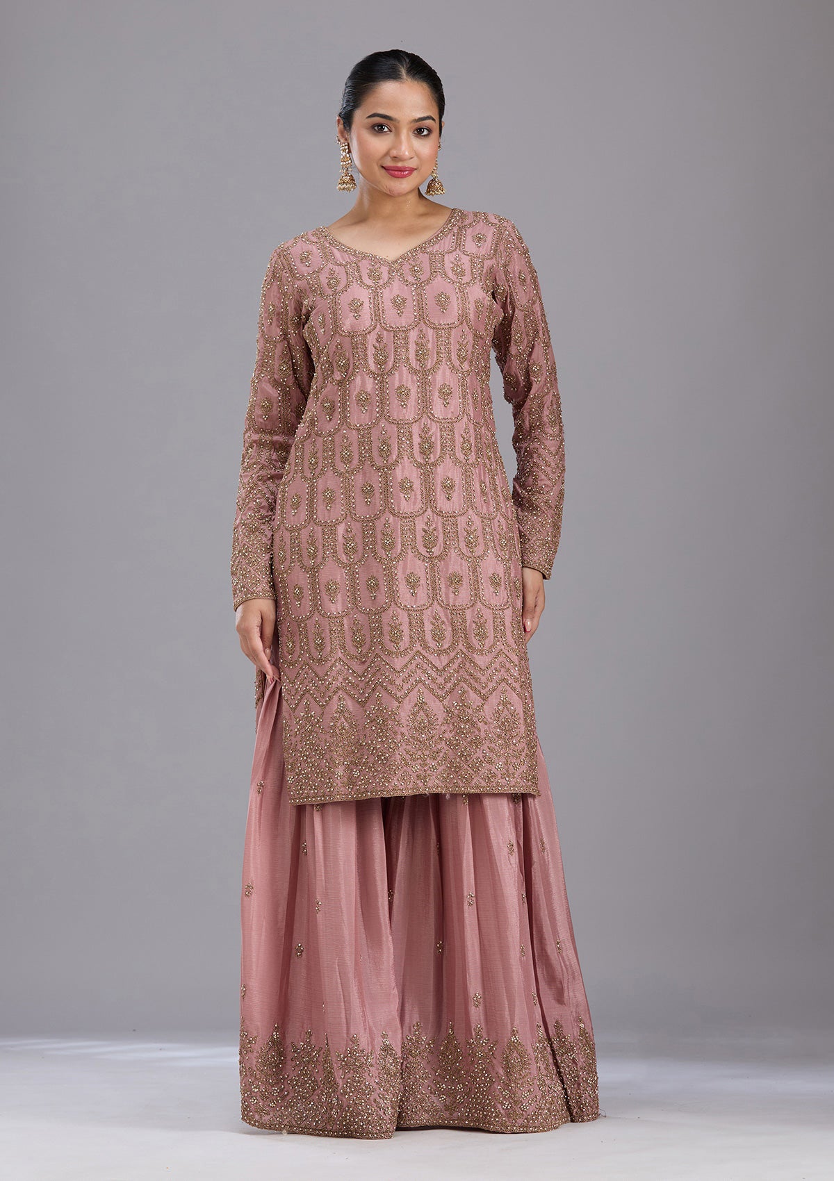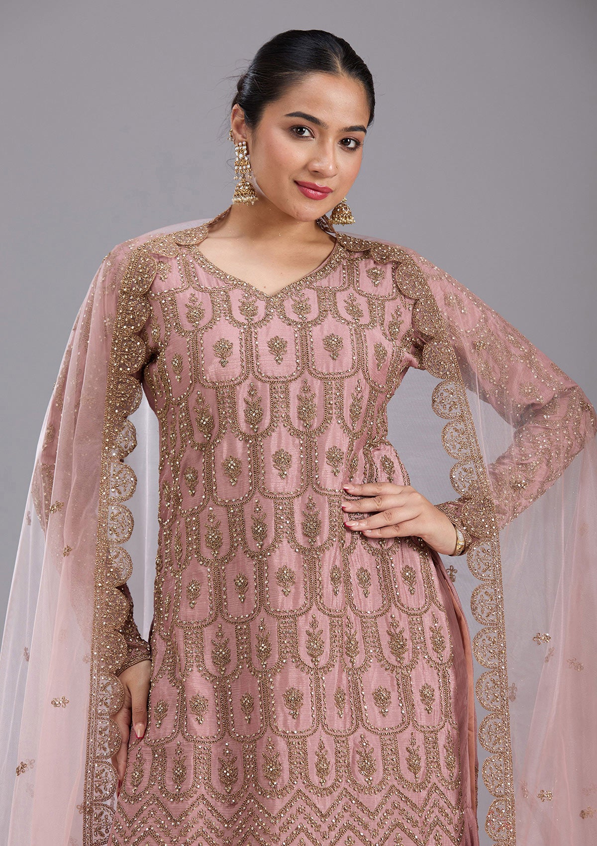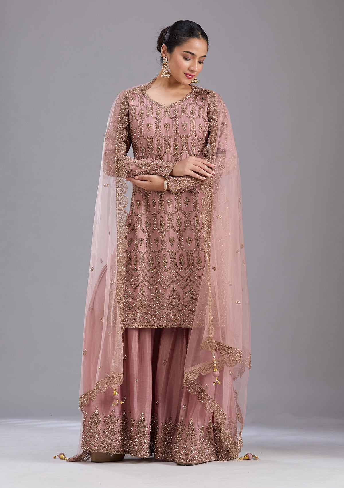 Pink Salwar Suit in Georgette fabric The Salwar Suit is embellished with Stonework (Gold) embroidery Accompanied with a bottom and dupatta Comes with the Koskii promise of premium quality.