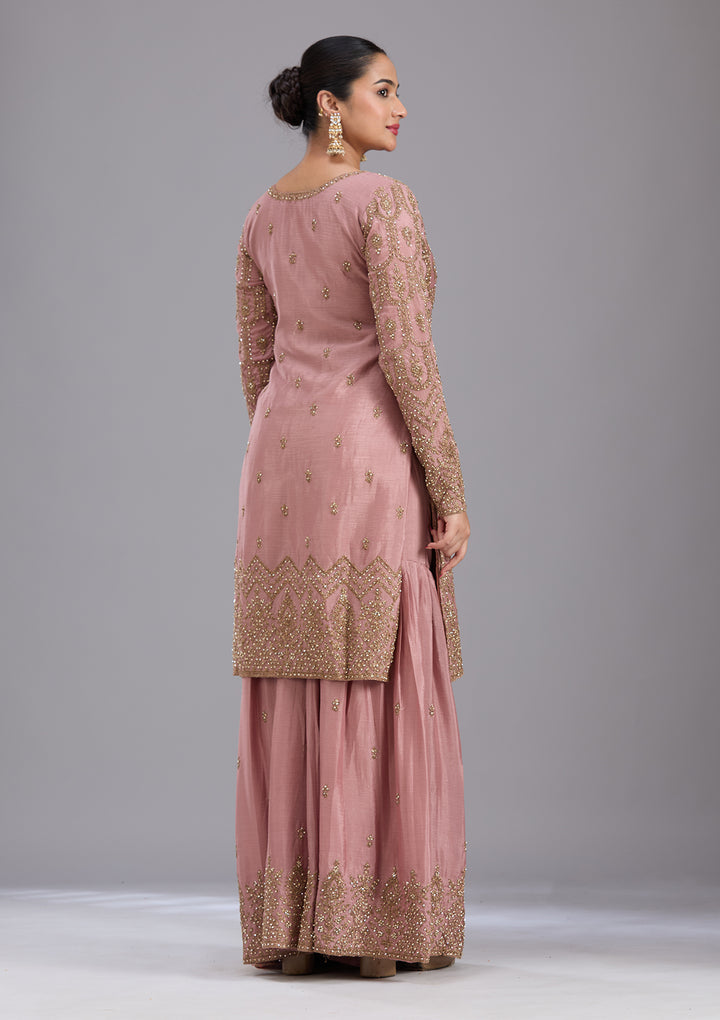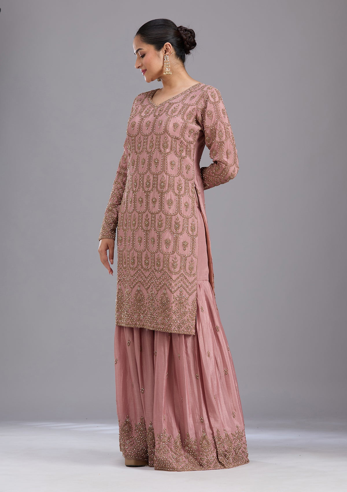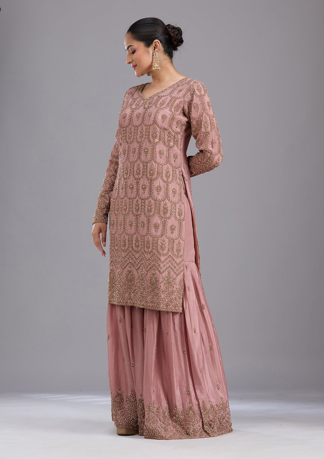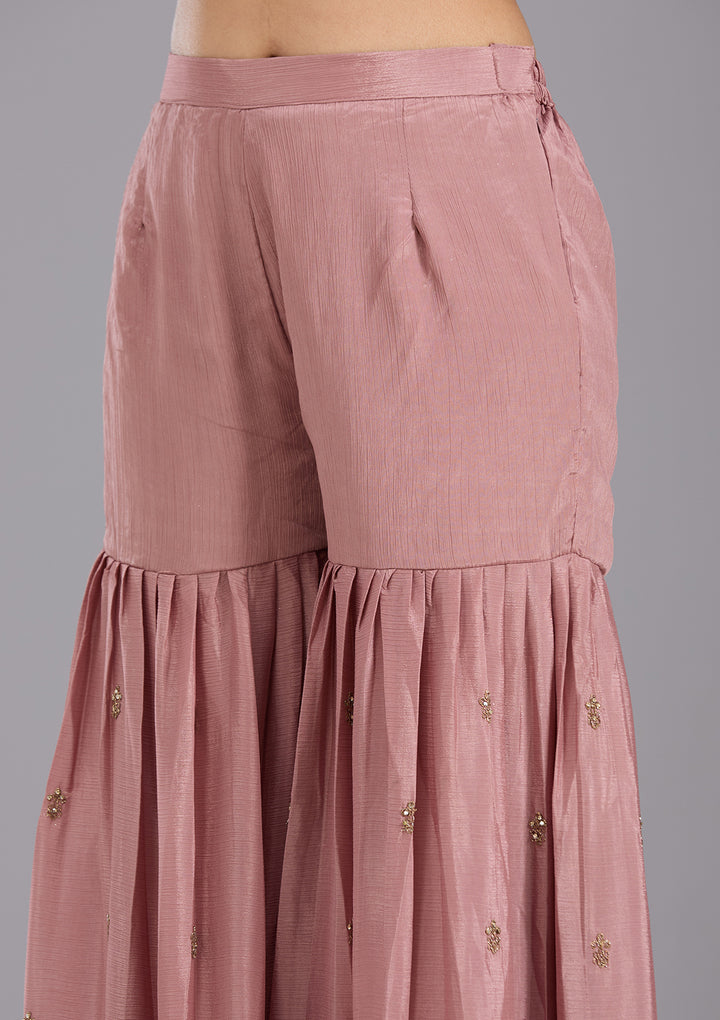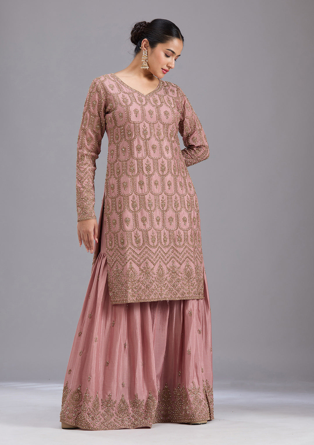 Pink Salwar Suit in Georgette fabric The Salwar Suit is embellished with Stonework (Gold) embroidery Accompanied with a bottom and dupatta Comes with the Koskii promise of premium quality.