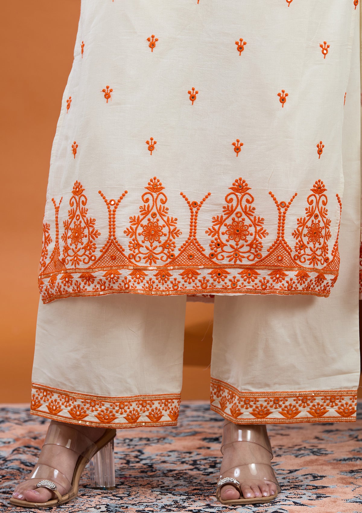 Off White Threadwork Chanderi Readymade Salwar Suit