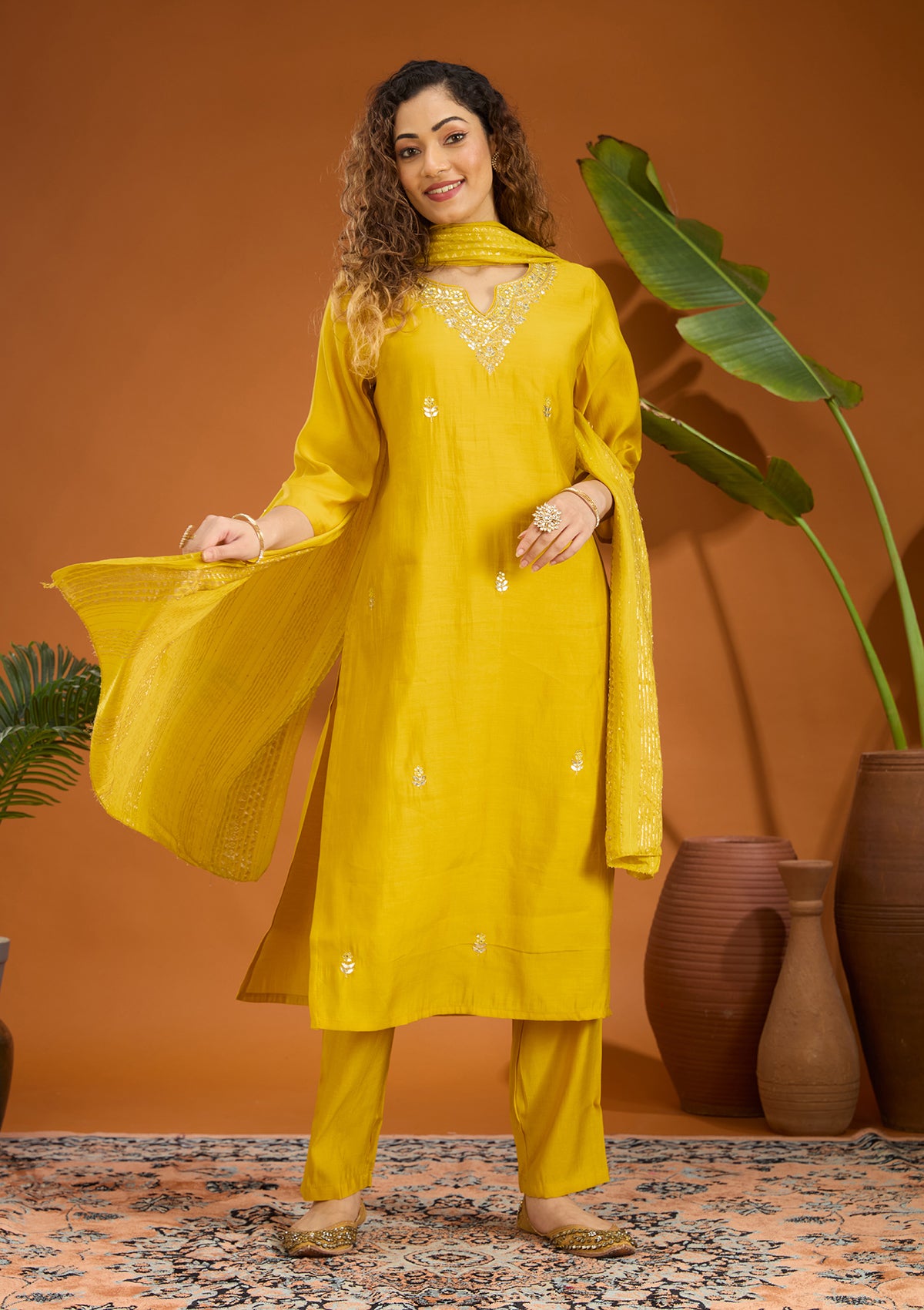 Yellow Salwar Suit in Soft Raw Silk fabric. The Salwar Suit is embellished with Zariwork embroidery. Accompanied with a bottom and dupatta. Comes with the Koskii promise of premium quality.