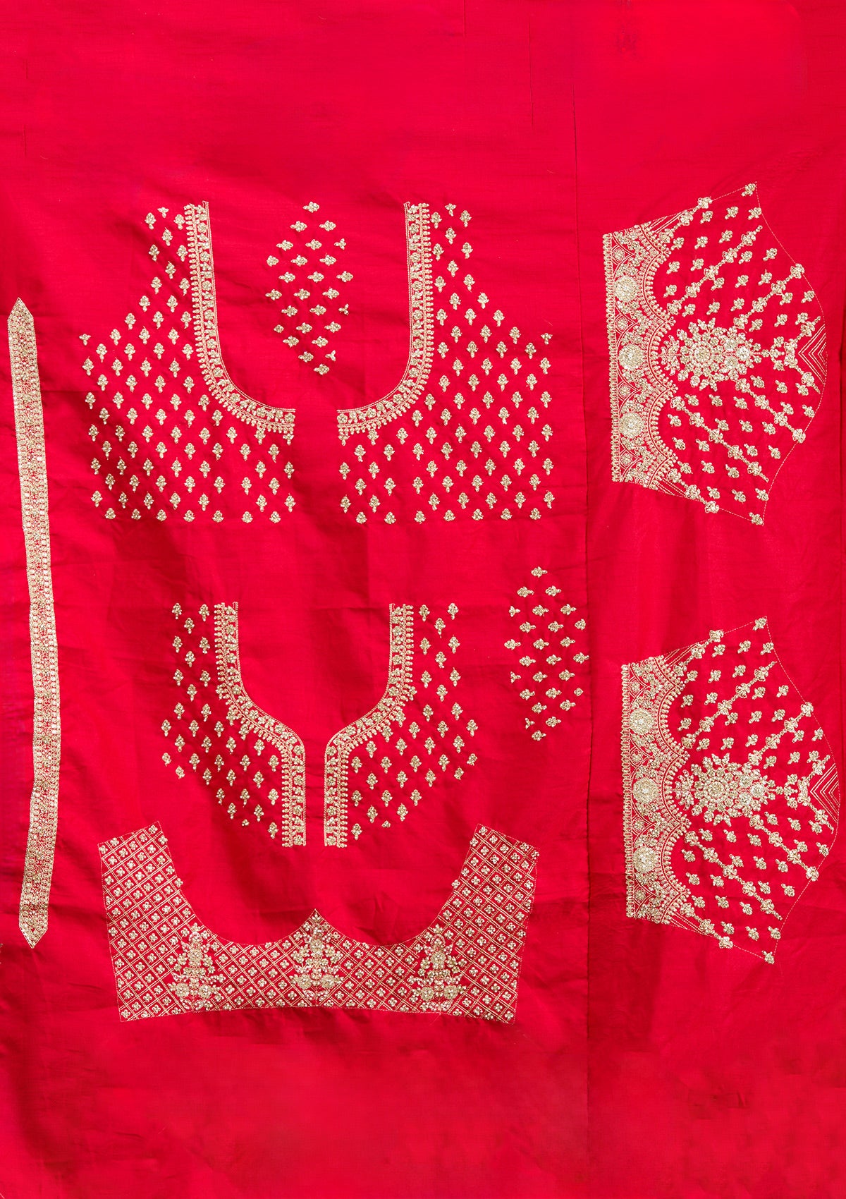Red Readymade Lehenga in Raw Silk fabric. The Lehenga is embellished with Cutdana embroidery. Accompanied with an Readymade blouse and dupatta. Comes with the Koskii promise of premium quality.