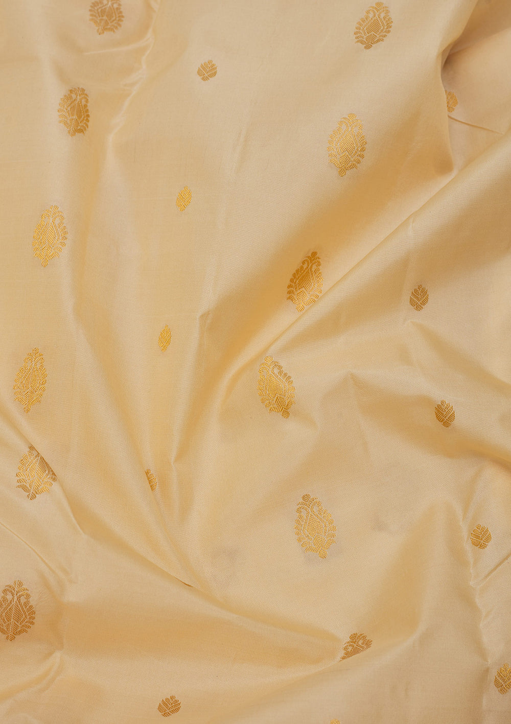 Cream Saree in Pure Silk fabric. The Saree is elevated with Zariwork embroidery. It comes with an Unstitched blouse. Comes with the Koskii promise of premium quality.