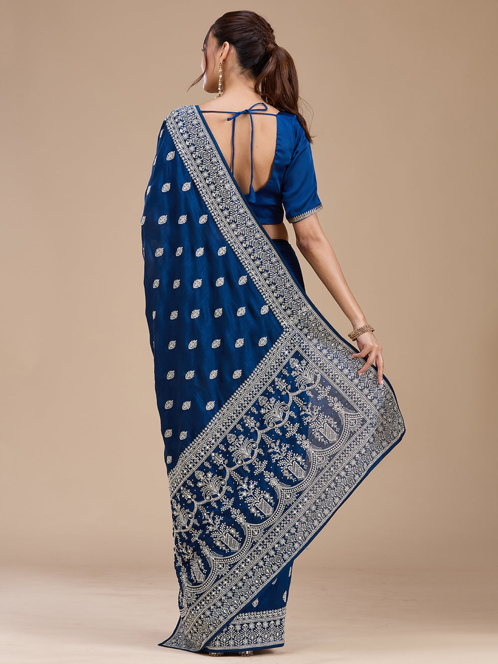 Peacock Blue Saree in Soft Raw Silk fabric. The Saree is elevated with Zariwork (Silver) embroidery. It comes with an Unstitched blouse. Comes with the Koskii promise of premium quality.