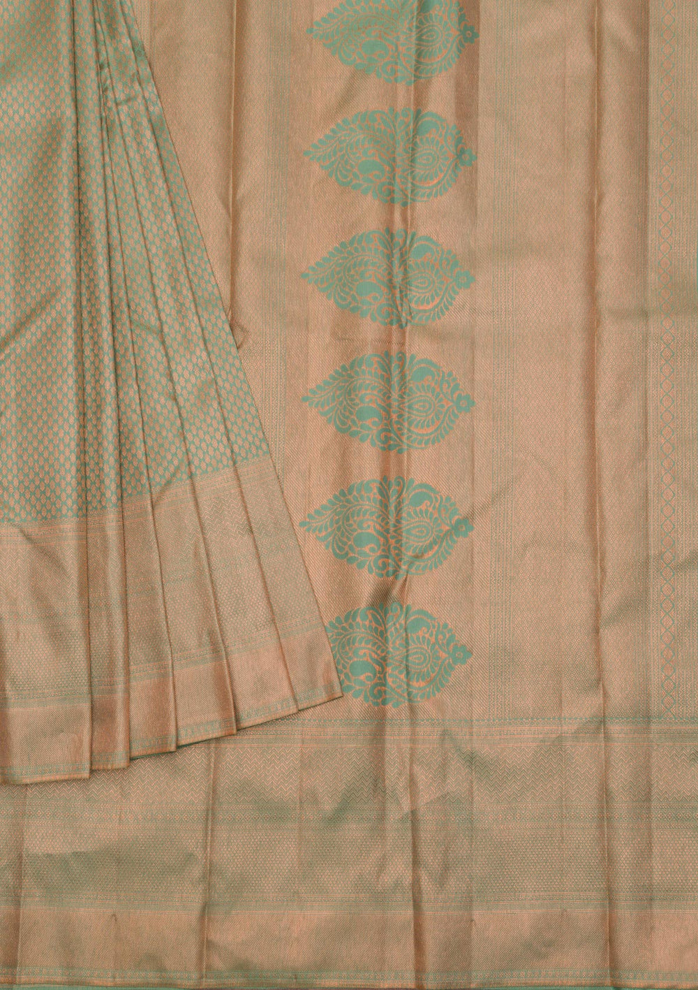 Pista Green Saree in Pure Silk fabric. The Saree is elevated with Copper Zariwork . It comes with an Unstitched blouse. Comes with the Indian Silk Mark certification.