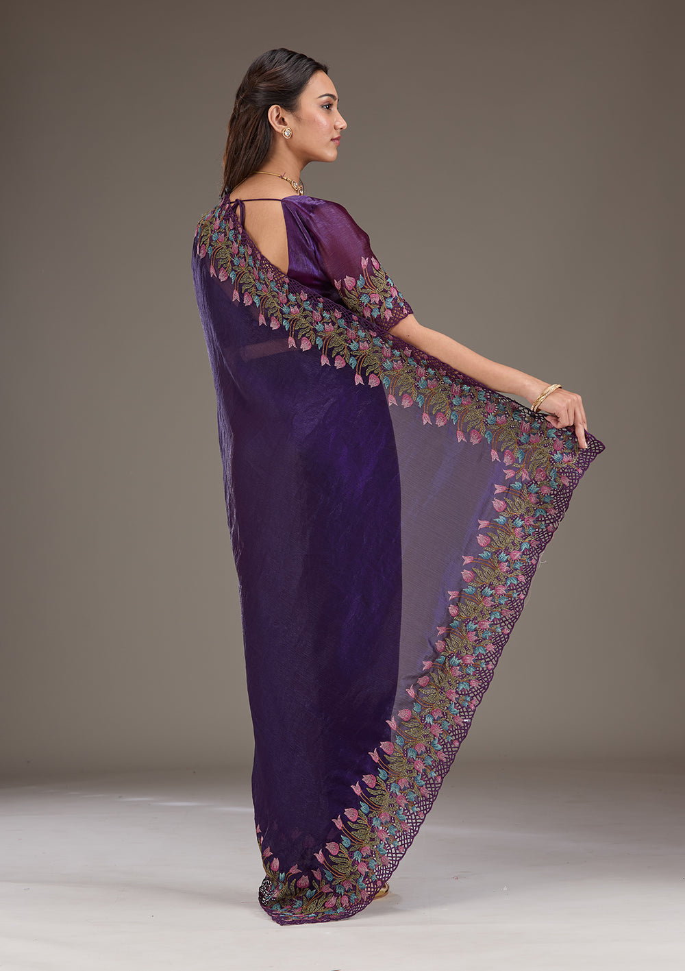 Radiate charm and grace in the Koskii Purple Tissue Saree, adorned with exquisite cutwork that dances along the borders with a playful yet sophisticated flair. The delicate tissue fabric drapes beautifully, shimmering subtly as you move, making it a perfect masterpiece for any gathering where you wish to make a memorable impression. Dive into a world of vibrant elegance with this stunning creation from Koskii, where every detail speaks of unmatched craftsmanship.