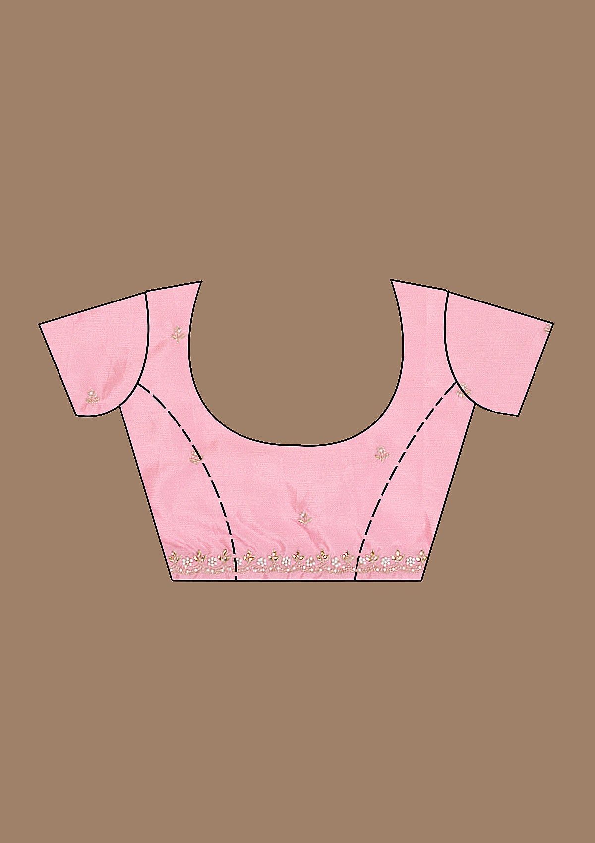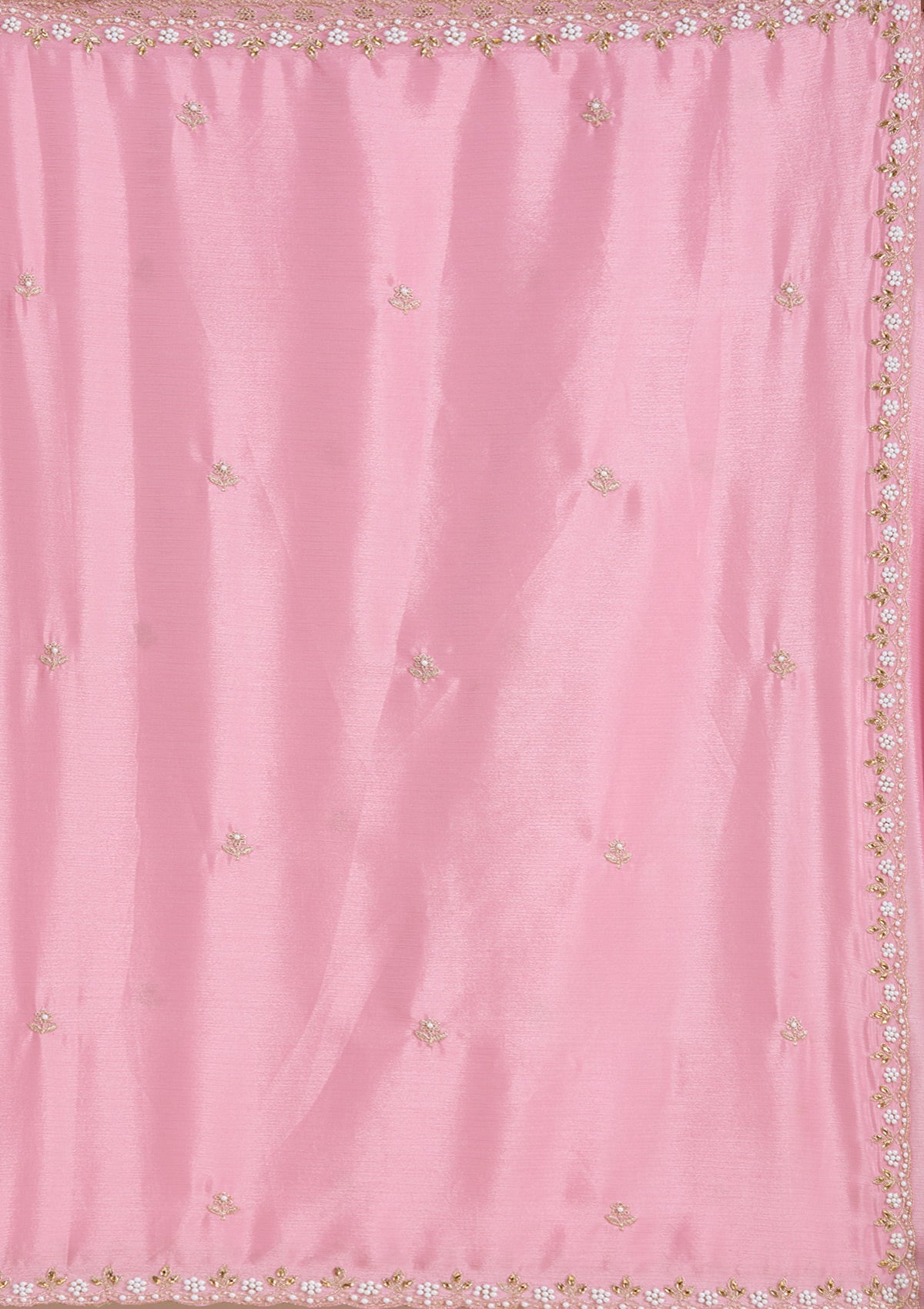 Onion Pink Saree in Chinon fabric. The Saree is elevated with Zariwork (Gold) embroidery. It comes with an Unstitched blouse. Comes with the Koskii promise of premium quality.