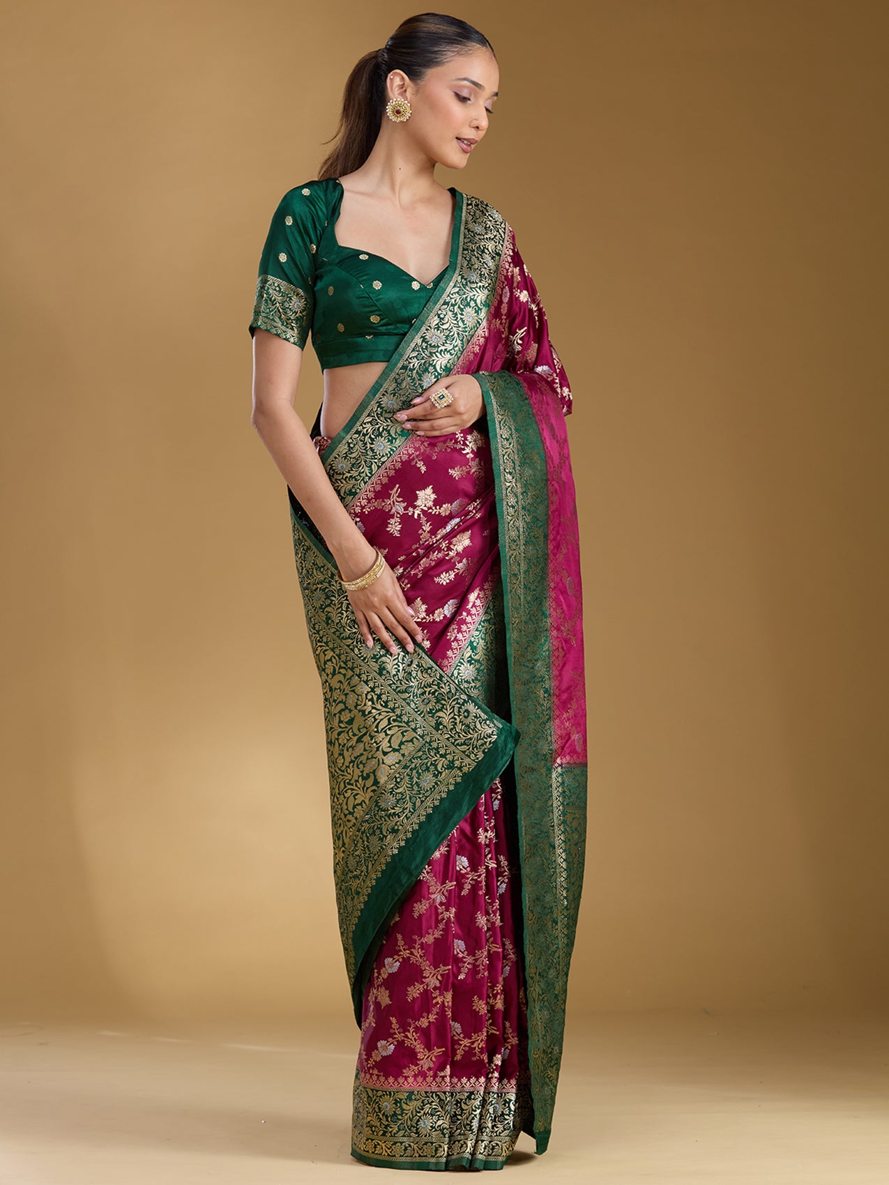 Bottle Green Silk_Saree in Art Silk fabric. The Silk_Saree is elevated with Zariwork (Gold) embroidery. It comes with an Unstitched blouse. Comes with the Koskii promise of premium quality.