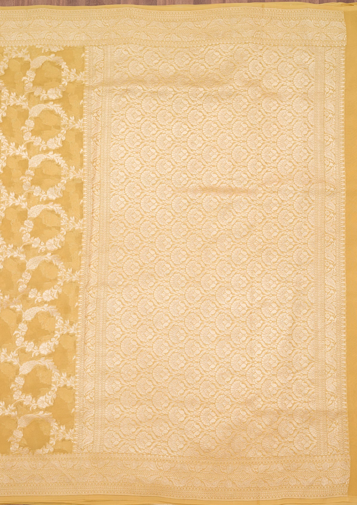 Gold Silk_Saree in Silk fabric. The Silk_Saree is elevated with Zariwork (Silver) embroidery. It comes with an Unstitched blouse. Comes with the Koskii promise of premium quality.