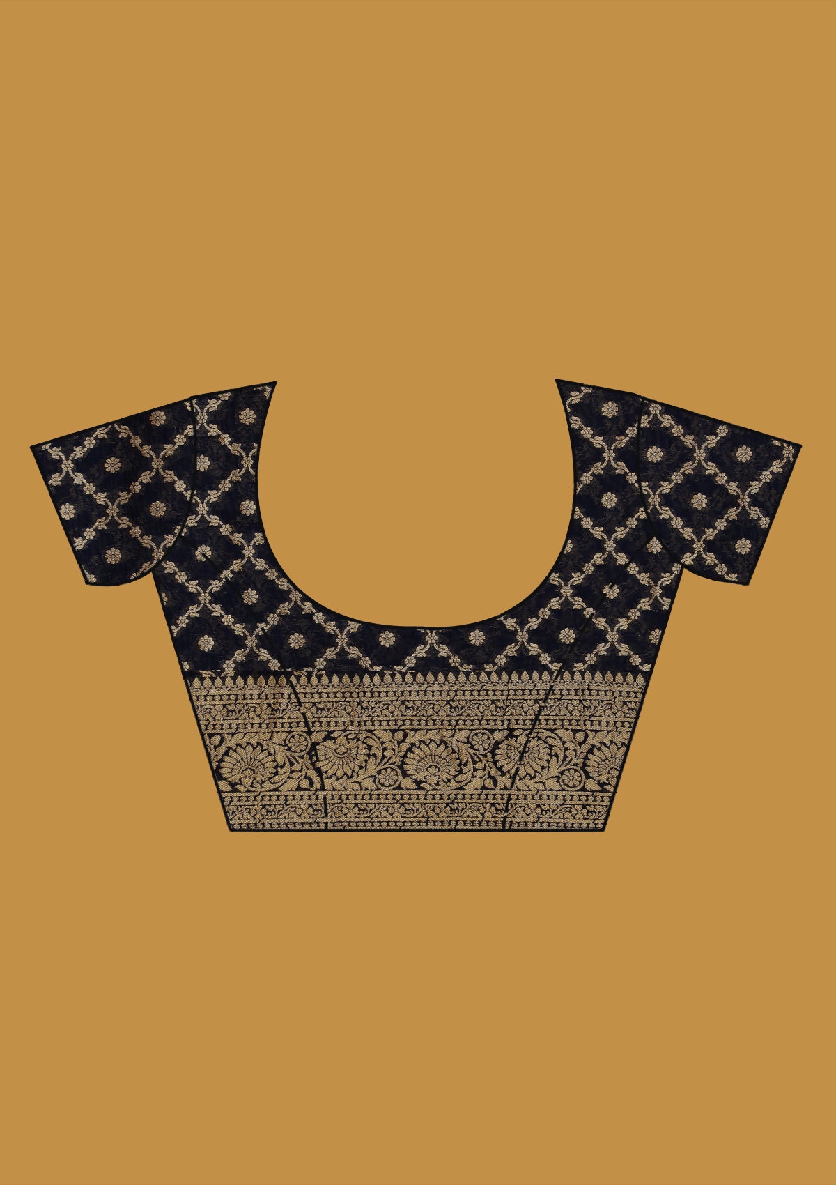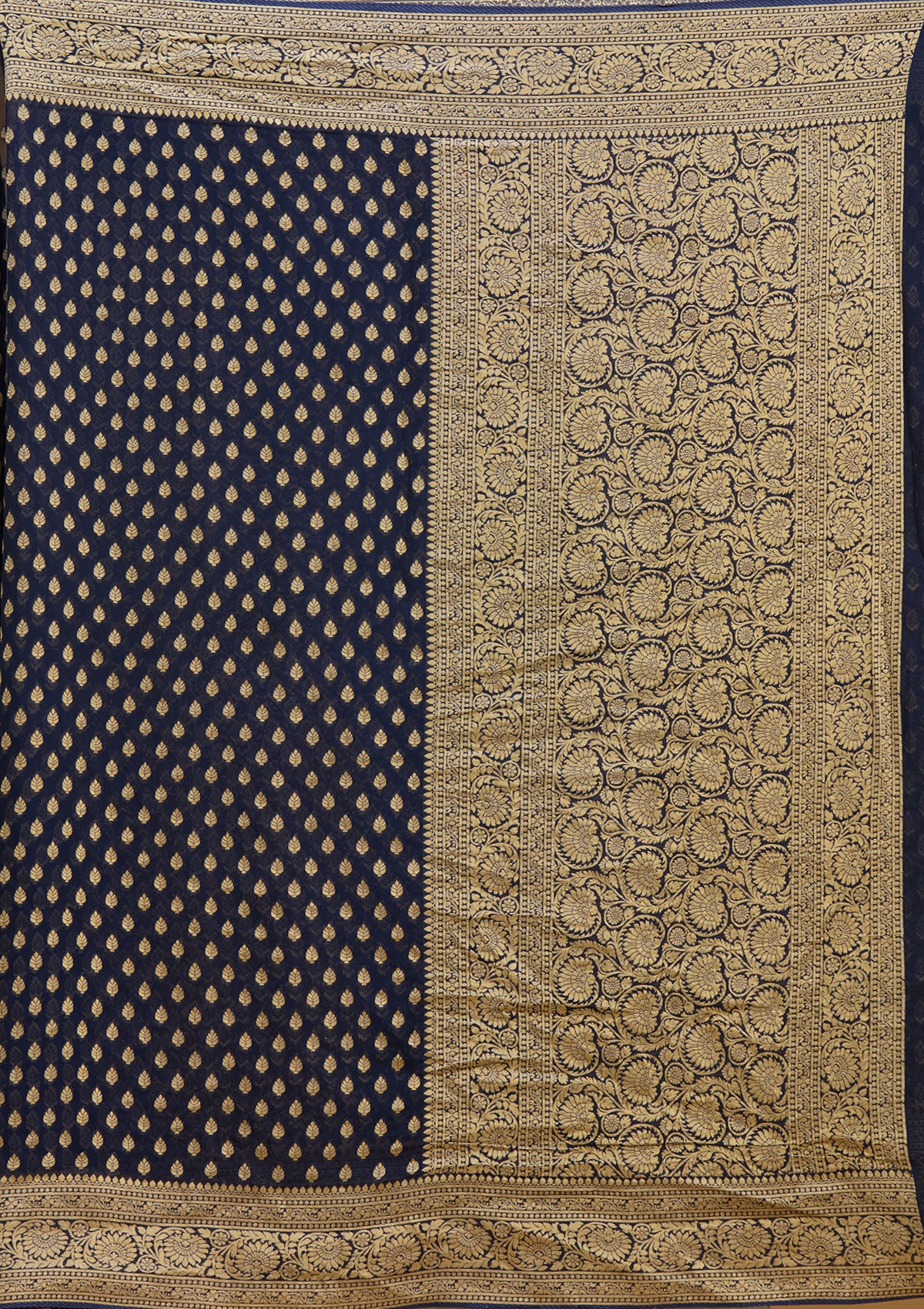 Navy Blue Silk_Saree in Georgette fabric. The Silk_Saree is elevated with Zariwork embroidery. It comes with an Unstitched blouse. Comes with the Koskii promise of premium quality.