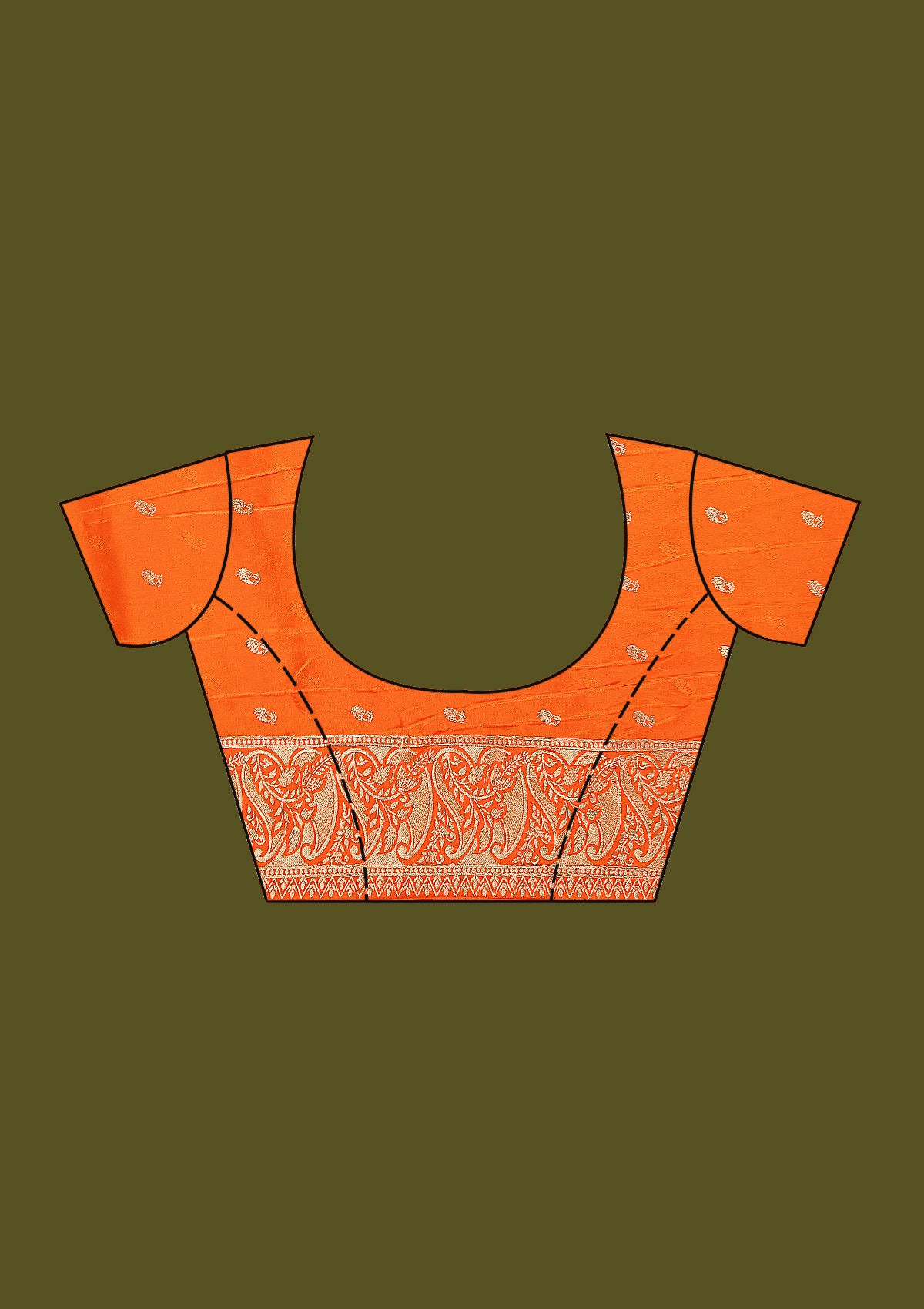 Orange Silk_Saree in Art Silk fabric. The Silk_Saree is elevated with Zariwork (Gold) embroidery. It comes with an Unstitched blouse. Comes with the Koskii promise of premium quality.