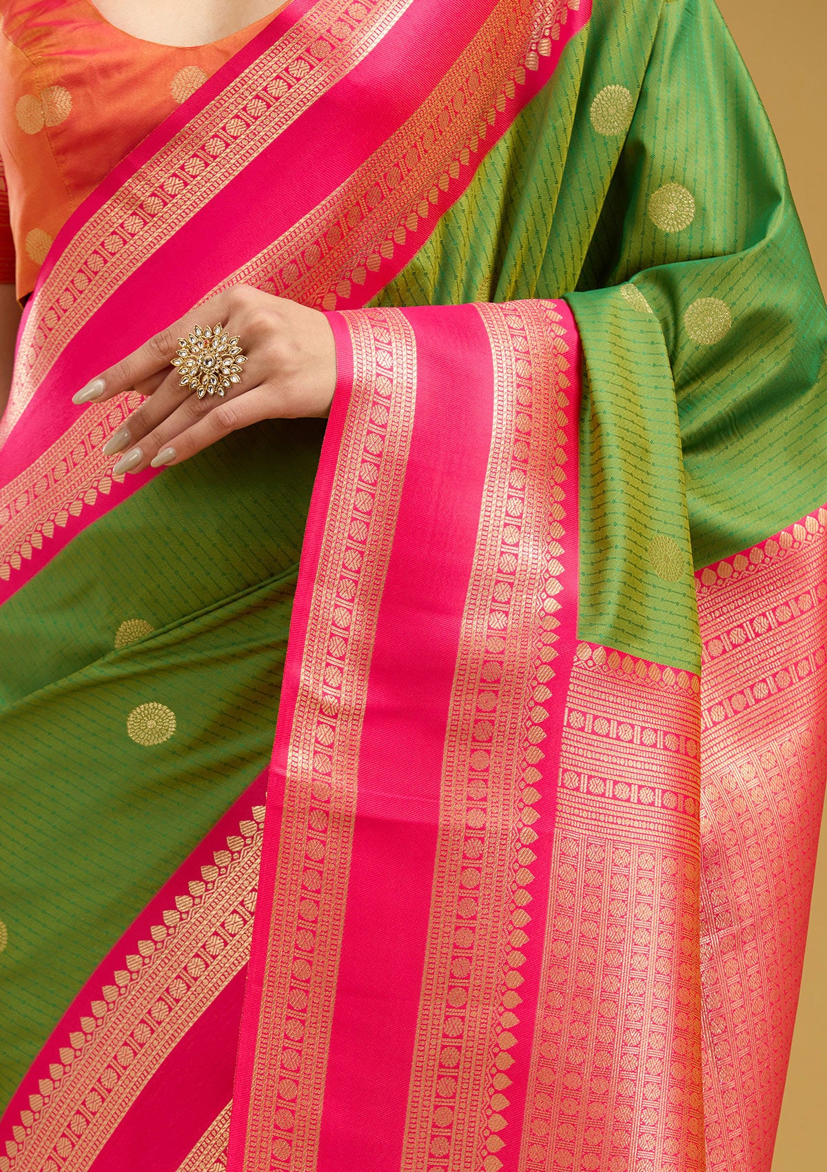 Parrot Green Silk_Saree in Silk fabric. The Silk_Saree is elevated with Zariwork (Gold) embroidery. It comes with an Unstitched blouse. Comes with the Koskii promise of premium quality.