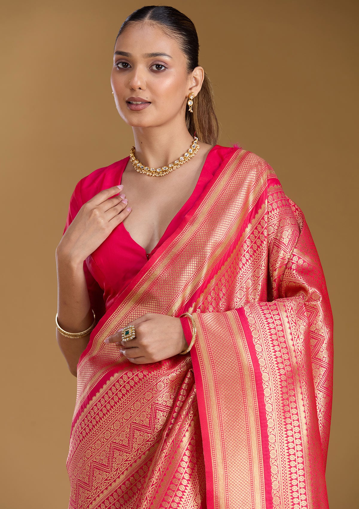 Rani Pink Silk_Saree in Art Silk fabric. The Silk_Saree is elevated with Zariwork (Gold) embroidery. It comes with an Unstitched blouse. Comes with the Koskii promise of premium quality.