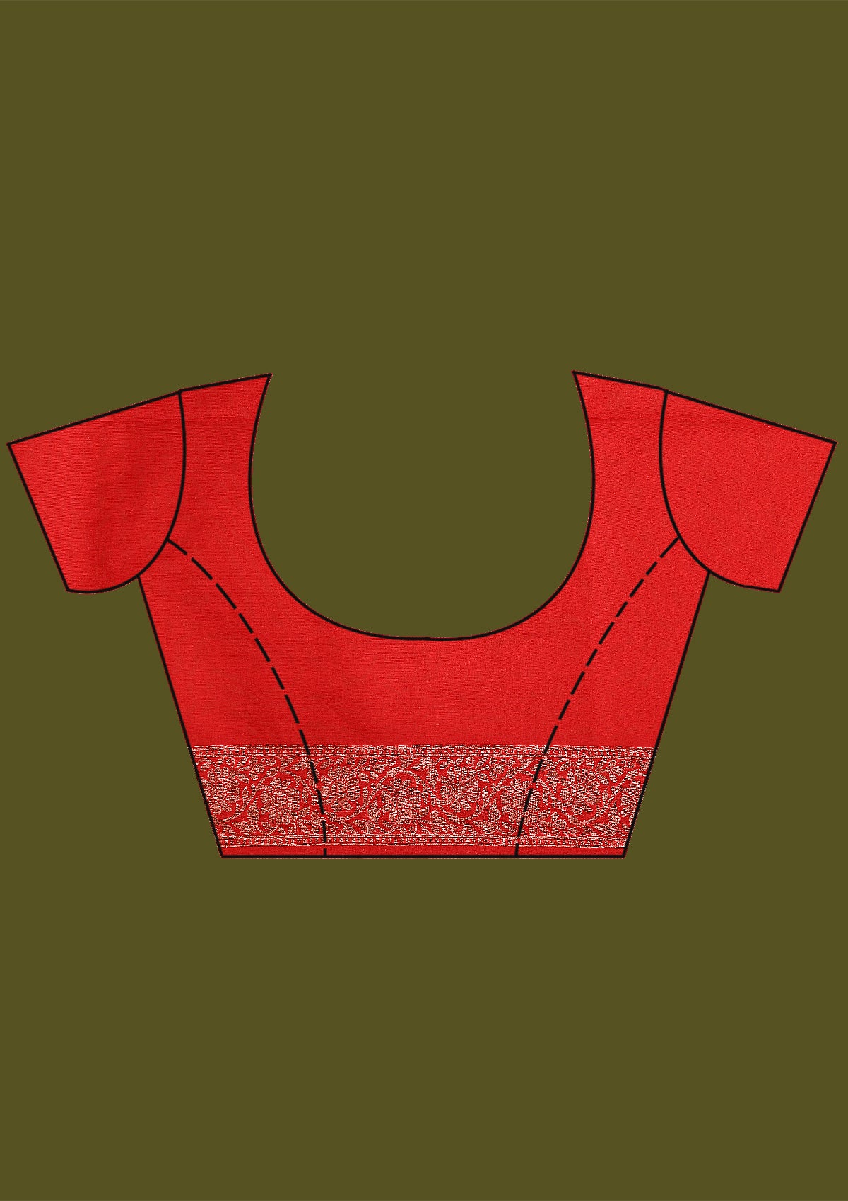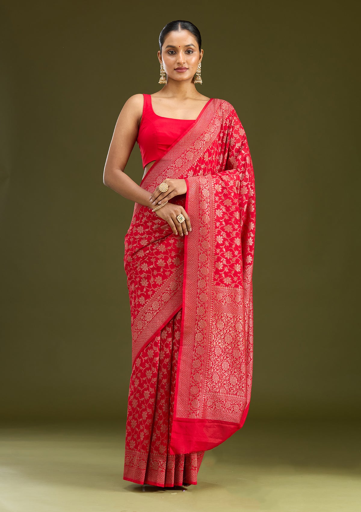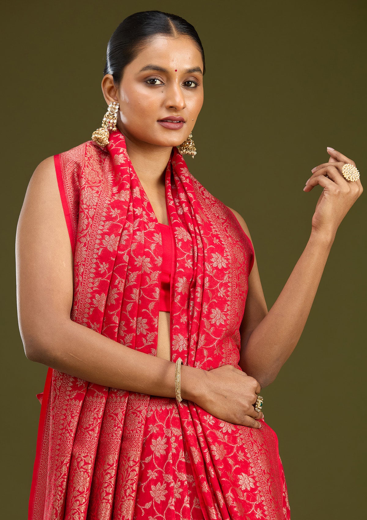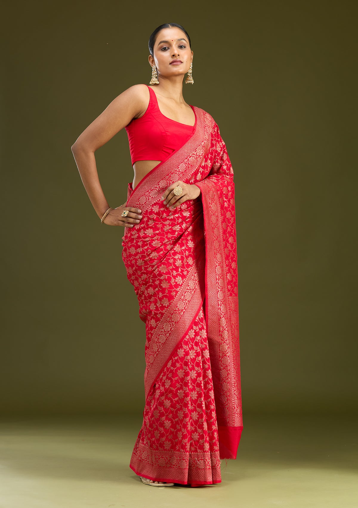 Red Silk_Saree in Silk fabric. The Silk_Saree is elevated with Zariwork (Gold) embroidery. It comes with an Unstitched blouse. Comes with the Koskii promise of premium quality.