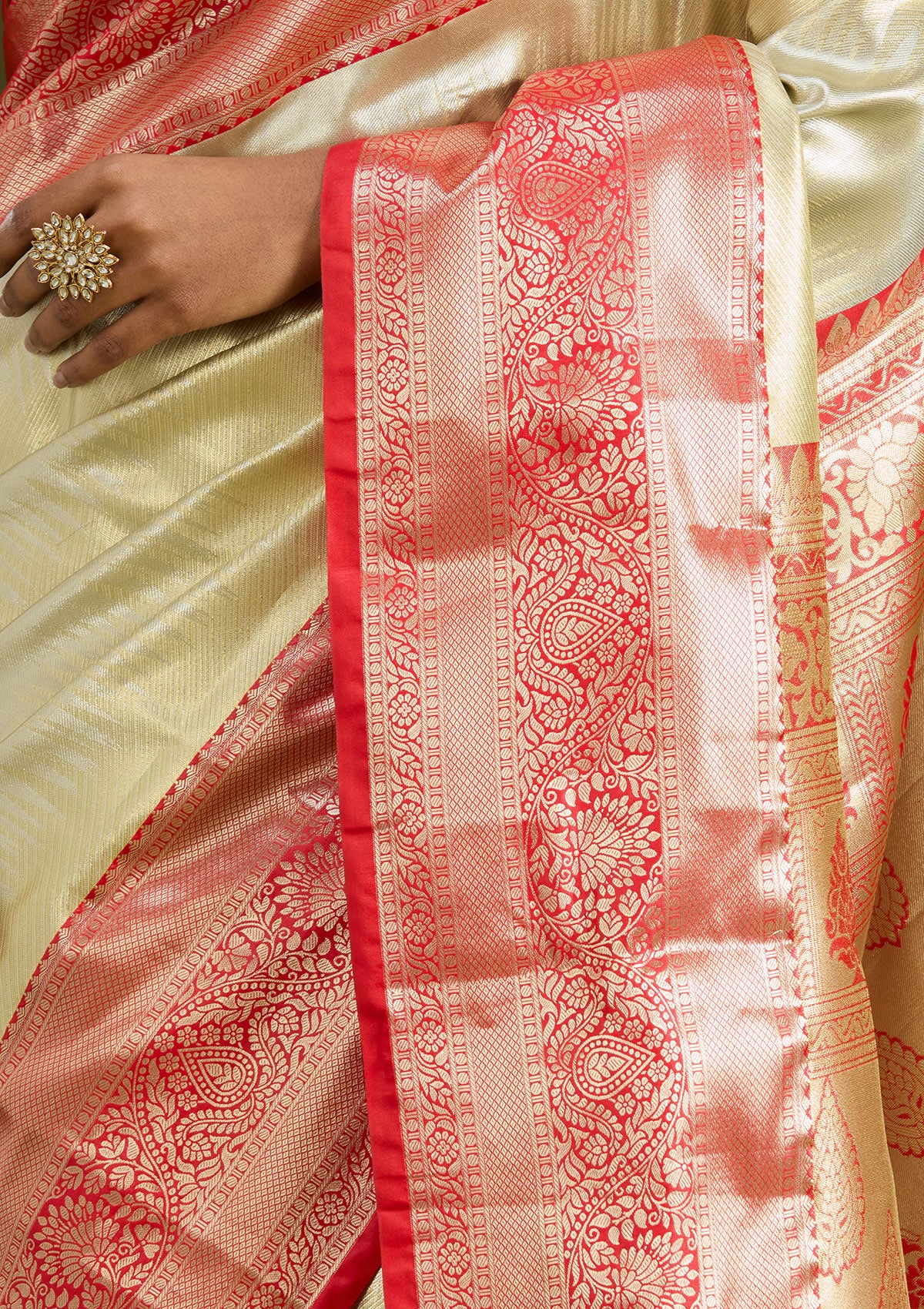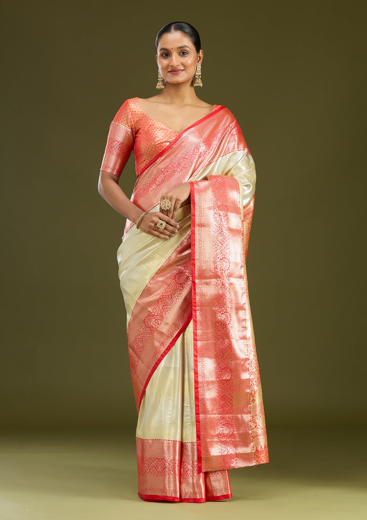 Silver Silk_Saree in Silk fabric. The Silk_Saree is elevated with Zariwork (Gold) embroidery. It comes with an Unstitched blouse. Comes with the Koskii promise of premium quality.