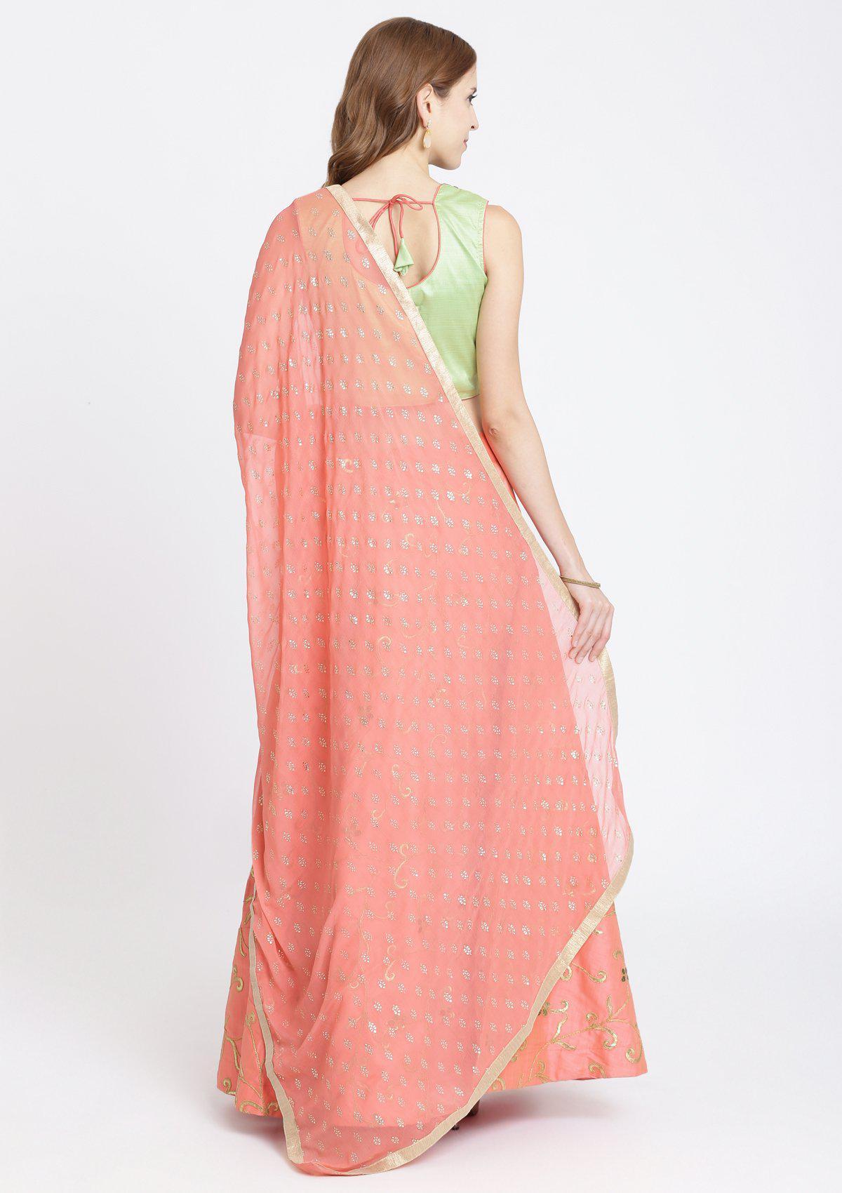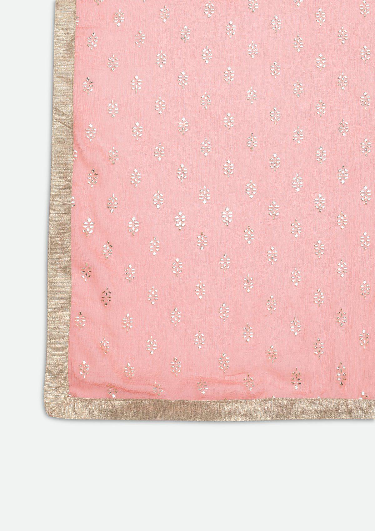 Baby Pink Readymade Lehenga In Raw Silk. Embellished With Mirrorwork Embroidery. Paired With A Blouse With Mirrorwork Embroidery. Enhanced With A Baby Pink Raw Silk Dupatta.