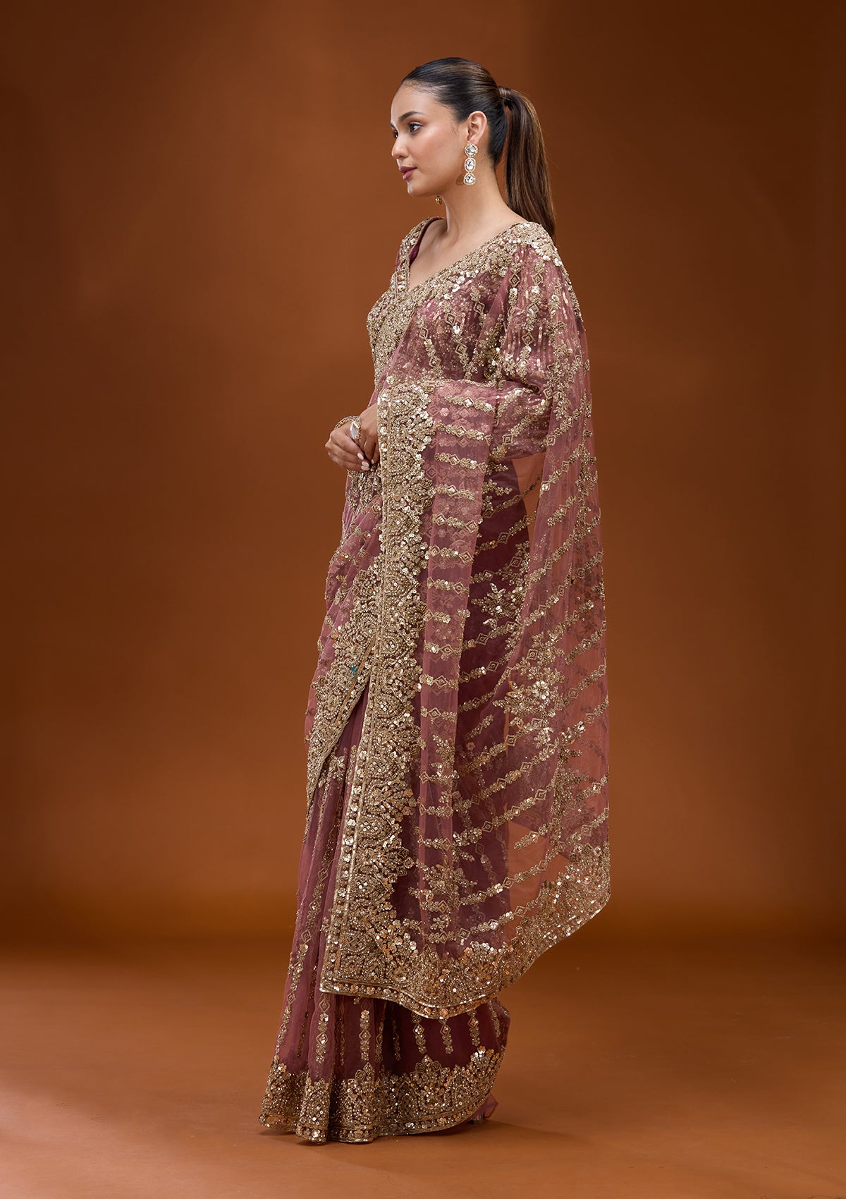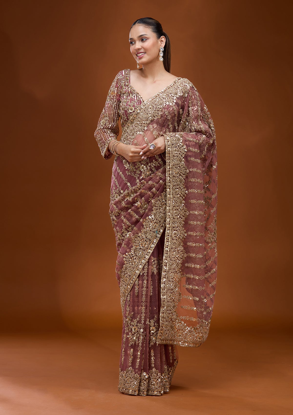 Onion Pink Saree in Net fabric. The Saree is elevated with Cording embroidery. It comes with an Unstitched blouse. Comes with the Koskii promise of premium quality.