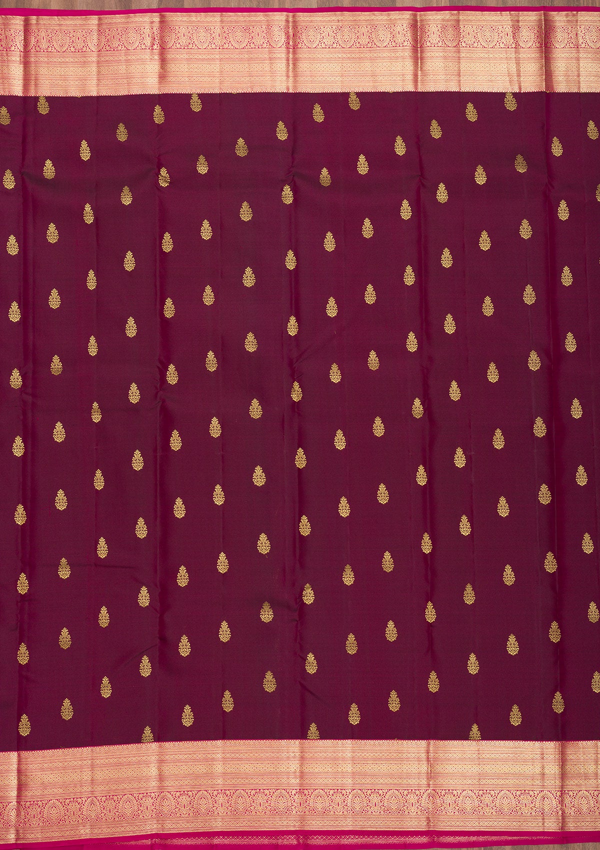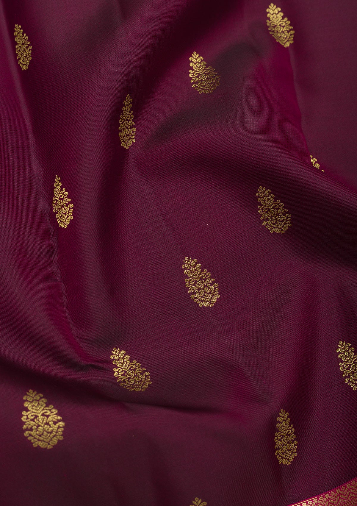 Wine Saree in Pure Silk fabric. The Saree is elevated with Zariwork embroidery. It comes with an Unstitched blouse. Comes with the Indian Silk Mark certification.