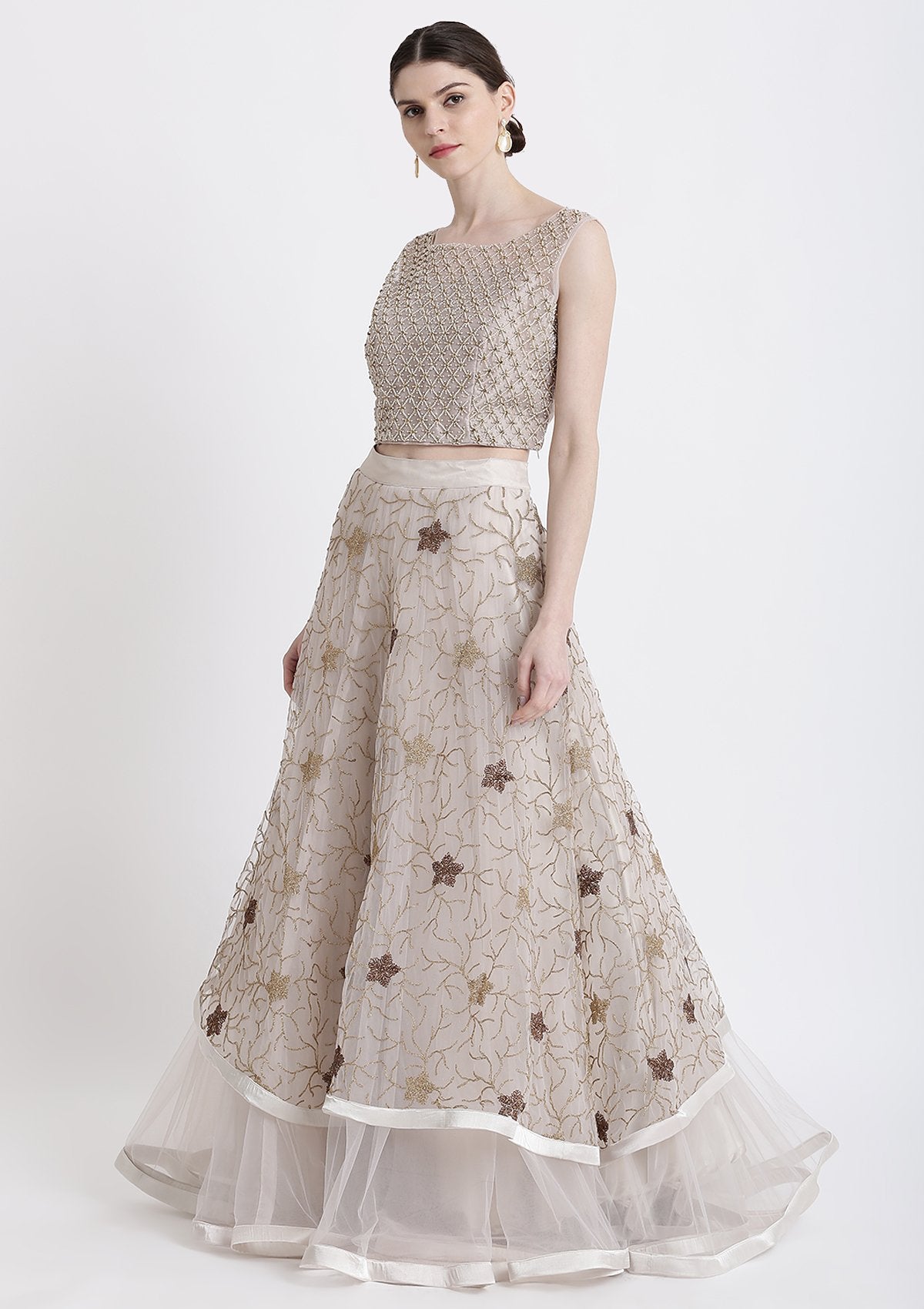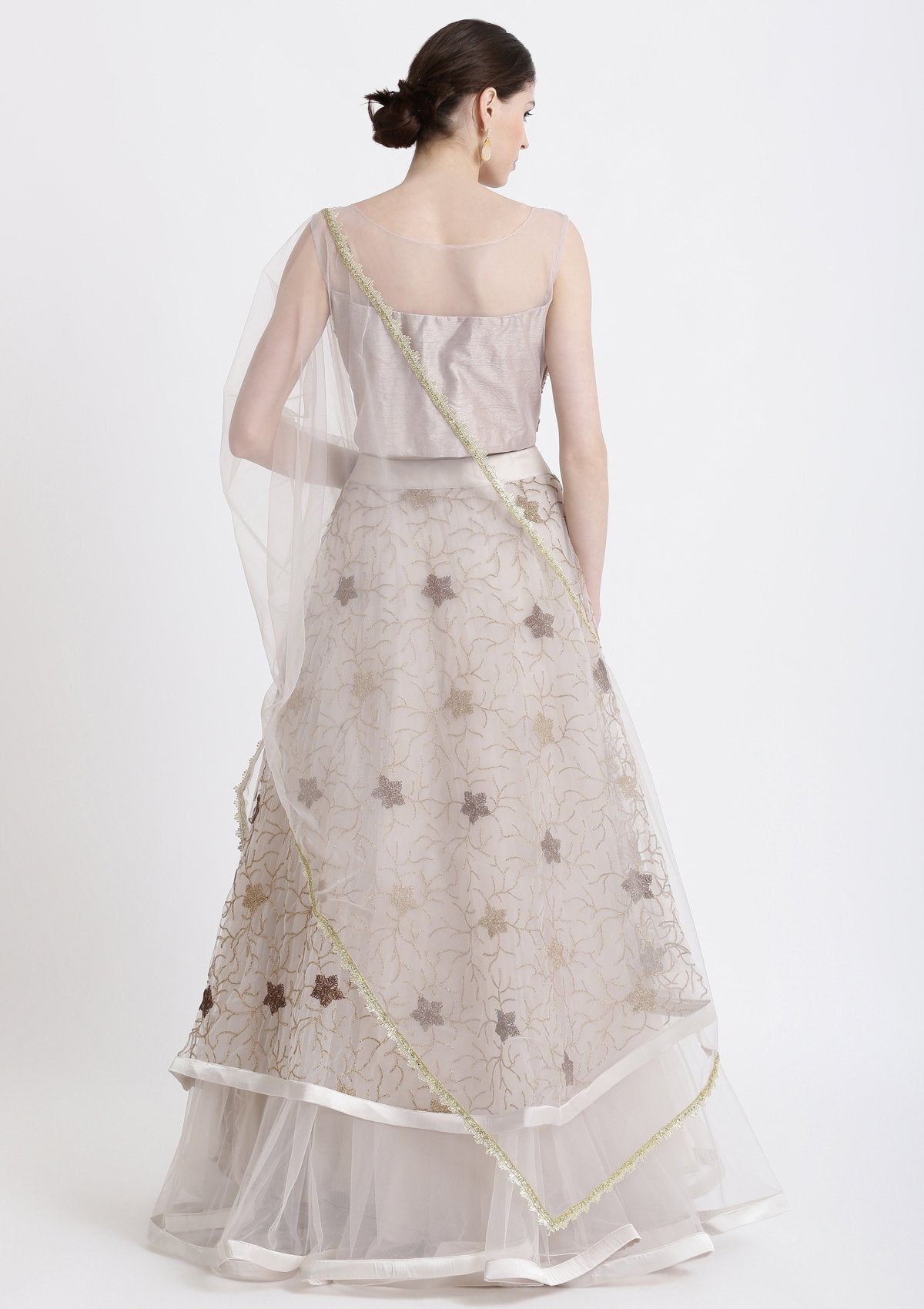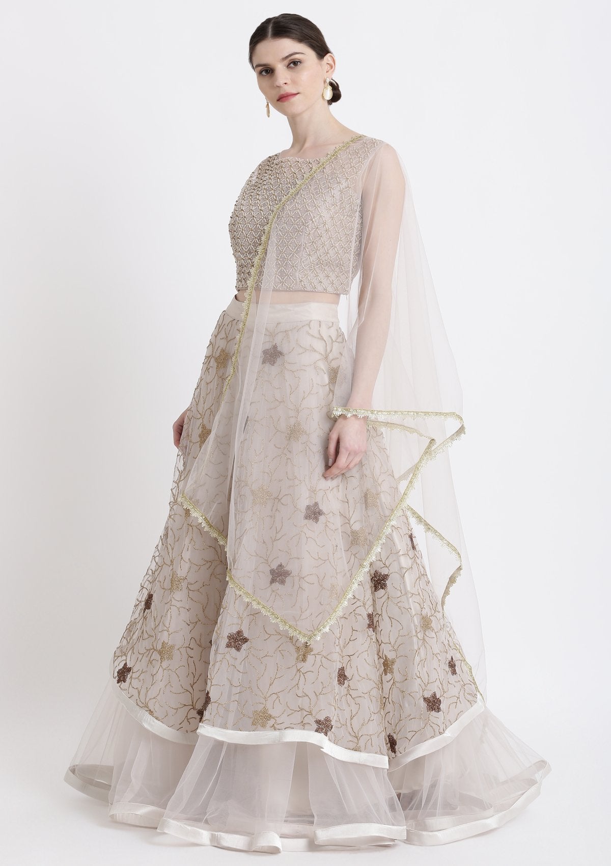Light Grey Pearlwork Net Designer Lehenga-Koskii