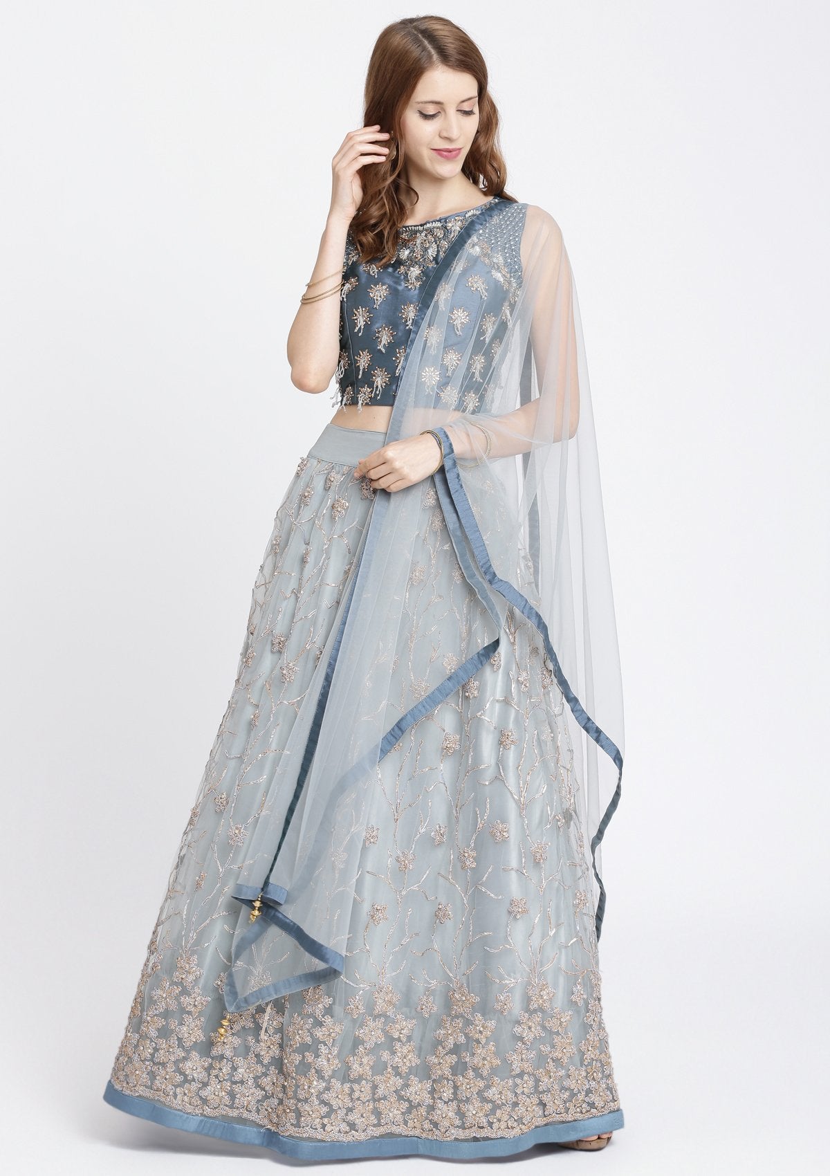 Light Grey Stonework Net Readymade Lehenga