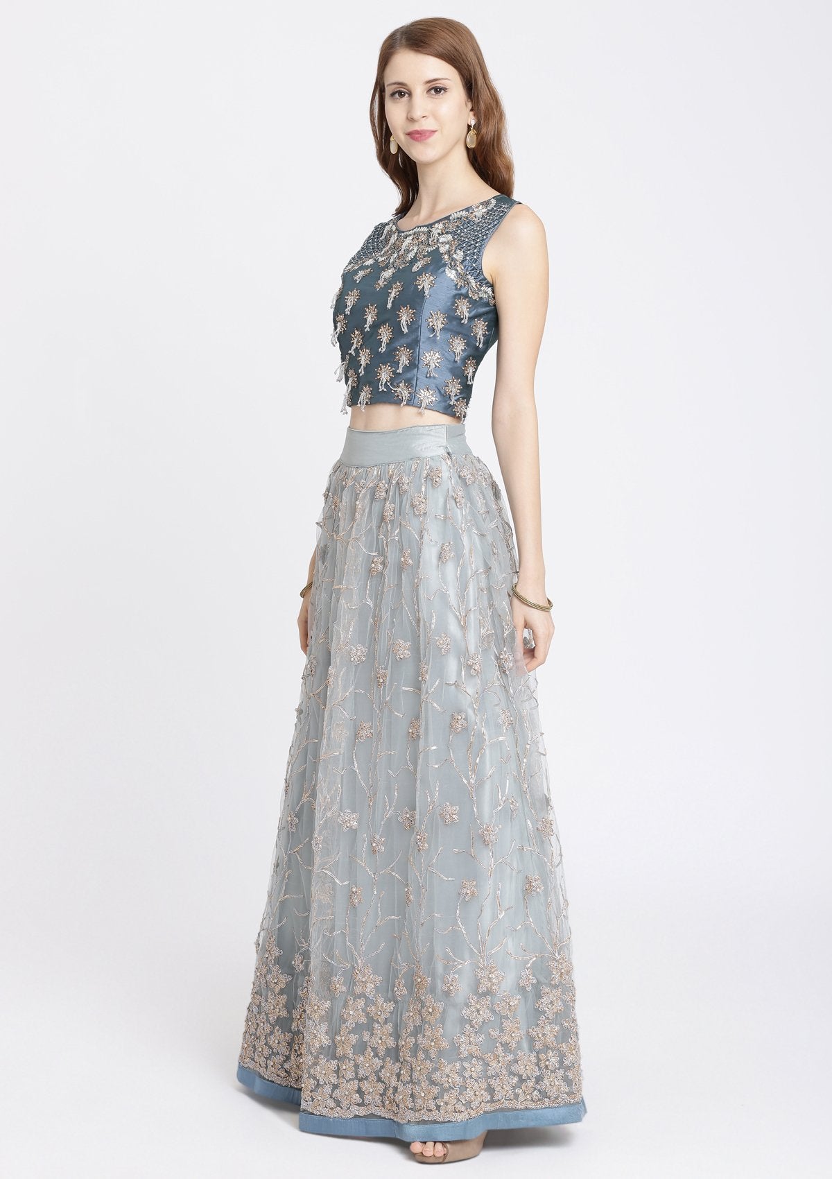 Light Grey Stonework Net Designer Lehenga-Koskii