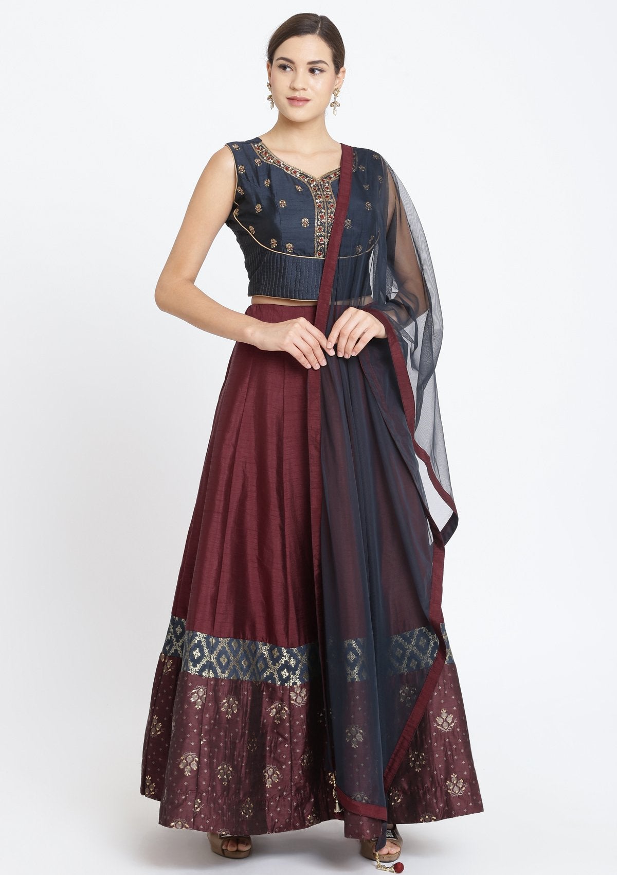 Maroon and Navy Blue Cutdana Rawsilk Readymade Lehenga